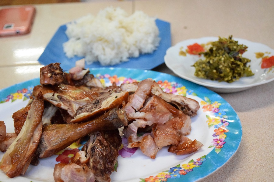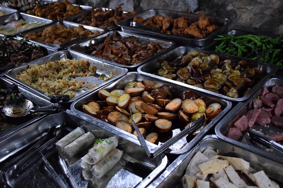 อาหารบุฟเฟ่ต์จะมีเนื้อหมู นมหมู เนื้อวัว ผักนานาชนิด และของทอดต่างๆ ส่วนของหวานจะมีผลไม้ ไอศกรีม น้ำแข็งใส เราไม่ทานเนื้อ จึงทานแต่หมู เนื้อหมูนุ่มมากทั้งที่ไม่ได้หมักอะไรเลย เหมือนเพิ่งเอาออกมาจากช่องแข็ง นมหมูจะเหนียวๆ หน่อย อิ่มแล้วก็เดินกลับที่พัก