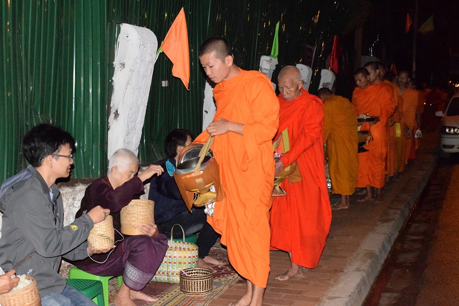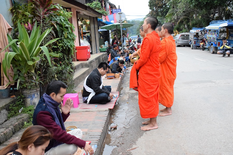 ตื่นแต่เช้าเตรียมใส่บาตรข้าวเหนียว พระจะมาเวลา 05.45- 06.30 น. บริเวณถนนใหญ่พระจะมา เวลา 05.45 น. แต่ในซอยด้านหน้าโรงแรมพระจะมาเวลา 06.30 น. พวกเราออกไปใส่บาตรที่ถนนใหญ่ ซื้อข้าวเหนียวในซอยไปด้วย และไปซื้อขนมเพิ่มที่ริมถนนใหญ่ เนื่องจากคนขายขนมมีเสื่อปูให้นั่งรอพระ เลยต้องอุดหนุนเพิ่ม