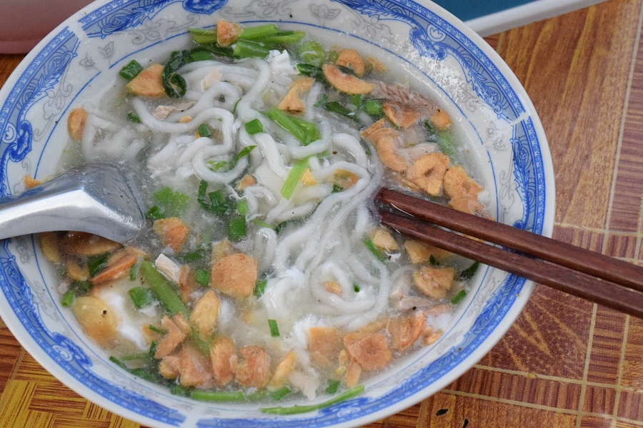 เดินเล่นกันจนพอใจก็กลับที่พัก ได้เวลาอาหารกลางวันพอดี จึงเดินไปทานข้าวเปียก ตรงข้ามวัดเชียงทอง ร้านนี้ถ้าไม่ตั้งใจดูจะไม่รู้เลยว่าเป็นร้านข้าวเปียก ขอเตือนว่าพริกเผ็ดมากแต่ก็อร่อย