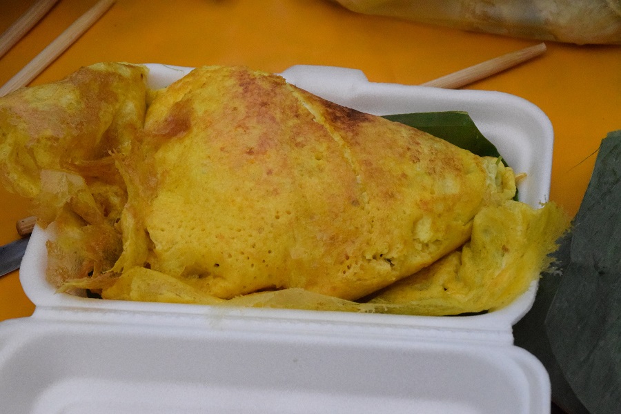 บริเวณนั้นมีร้านเฝอด้วย แต่ขายเฉพาะช่วงเช้า เราเลยอดกิน เนื่องจากวันนี้ตั้งใจเก็บร้านอาหารในรีวิวให้หมดจึงเดินต่อไปทานขนมเบื้องลาว ภาษาลาวเรียกว่าแหนมเหลือง แต่ก่อนขายอยู่ริมโขง แต่ช่วงที่ไปบริเวณริมโขงรัฐบาลกำลังปรับปรุงพื้นที่ ร้านจึงย้ายมาอยู่ด้านบน ให้เดินเลียบริมโขงมาเรื่อยๆจะเห็นป้ายขนมเบื้องลาวอยู่ที่หน้าซอย ในหนึ่งจานจะมีไข่ 2 ฟอง แป้งสีเหลือง หมูยอ แหนม ผักบุ้ง ถั่วงอก แล้วมีน้ำจิ้มหวานๆ ให้เราปรุงเอง เราก็บีบมะนาว 2 ซีก ใส่พริกและถั่วลิสงคั่วบด ทานคู่กับขนมเบื้องลาวจะเข้ากันเป็นอย่างดี ระวังพริกขี้หนูที่อยู่ในขนมเบื้องนะคะ 1 จานจะมี 1 เม็ด ราคาจานละ 20,000 กีบ ร้านเปิดเวลา 8.30-18.00 น.