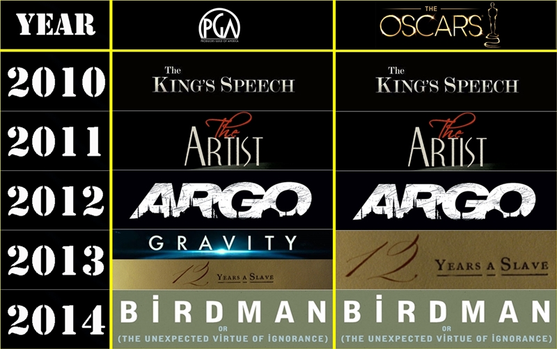 และนี่เป็นสถิติ 5 ครั้งล่าสุดค่ะ ในปีที่แล้ว สมาคมวิจารณ์หนัง และงานประกาศรางวัลต่างๆต่างพากันยกรางวัลภาพยนตร์ยอดเยี่ยมให้กับ Boyhood จนหนังเรื่องนี้กลายเป็นเต็งหนึ่งในช่วงแรกของช่วงการประกาศรางวัล จนกระทั่ง Birdman สามารถชนะ PGA ได้ กระแสก็เปลี่ยนใหม่หมด กลายเป็น Birdman มาเป็นเต็งหนึ่ง และสุดท้าย Birdman ก็ชนะภาพยนตร์ยอดเยี่ยมของออสการ์ไป
