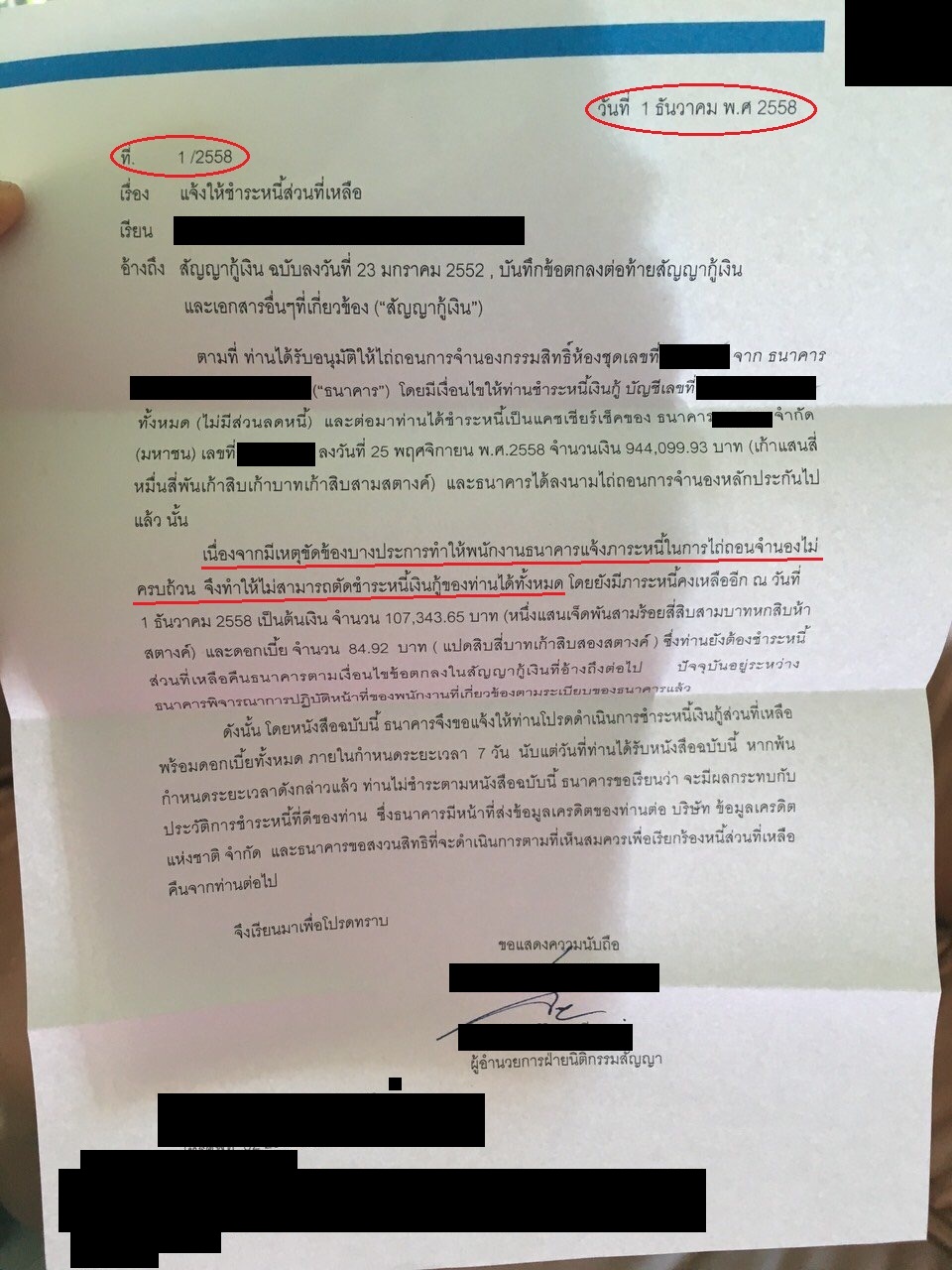 ผ่านมาสักหลายวัน ได้รับจดหมายหัวกระดาษจากธนาคาร ครับ “จดหมายเลขที่ 1/2558 ลงวันที่ 1 ธันวาคม 2558” ลงนามโดย ผู้อำนวยการฝ่ายนิติกรรมสัญญา เนื้อความตามจดหมายก็ตามที่แนบมาครับ ซึ่งผมก็ไม่ตอบรับอะไรไป แต่ที่สงสัยก็คือจดหมายออกวันที่ 1 ธันวาคม 2558 แต่เลขที่จดหมายคือ 1/2558 นี่แสดงว่าทั้งปีฝ่ายนิติกรรมสัญญาไม่เคยออกจดหมายอะไรเลยหรอครับ แล้วตราประทับของธนาคารก็ไม่มี แบบนี้คือเป็น official จากธนาคารจริง หรือทำกันเองภายในฝ่ายฯ ครับ