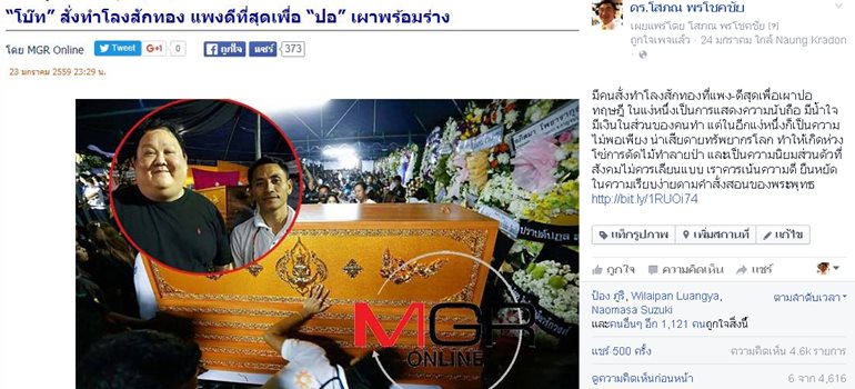 1. มีคนสั่งทำโลงสักทองที่แพง-ดีสุดเพื่อเผาปอ ทฤษฎี ในแง่หนึ่งเป็นการแสดงความนับถือ มีน้ำใจ มีเงินในส่วนของคนทำ