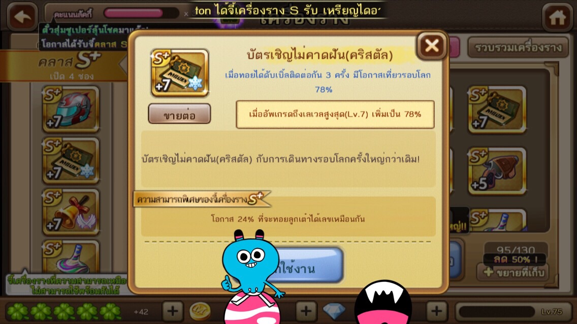 พอดีผมจะลองไปลุยห้อง เพลท ดูครับ ส่วนเรื่องจี้ กับตัวละคร ก็มีดังนี้นะครับ การ์ดบอย S+ 30 จี้เครื่องรางที่มีอยู่คือ 1.เล็บอินทรี S+ +5 ความสามารถ เพิ่มคู่/คี่ +1 2.หมวกกันน๊อค S+ +5 ความสามารถ โอกาส