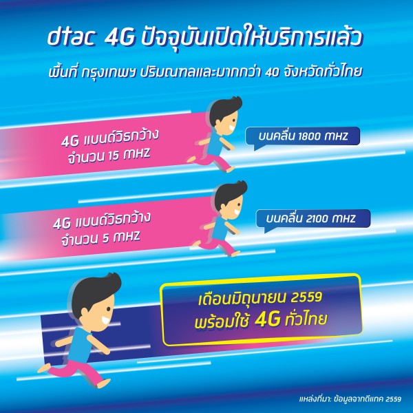 dtac ผู้ให้บริการด้านระบบสื่อสารของไทย เผยข้อมูลและสถิติที่น่าสนใจเกี่ยวกับการใช้งาน 4G ในเดือนมกราคมปี 2559 โดยพบว่าปัจจุบันมีผู้ใช้งาน dtac 4G อยู่ถึง 2.5 ล้านราย ซึ่งส่วนใหญ่เป็นผู้ใช้บริการรายเดือน คิดเป็น 58 %