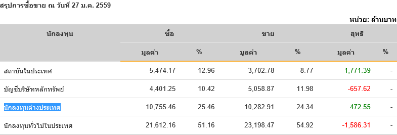 Sinthorn Summary 27/1/2559 : ต่างชาติซื้อสุทธิ 472.55 ลบ.