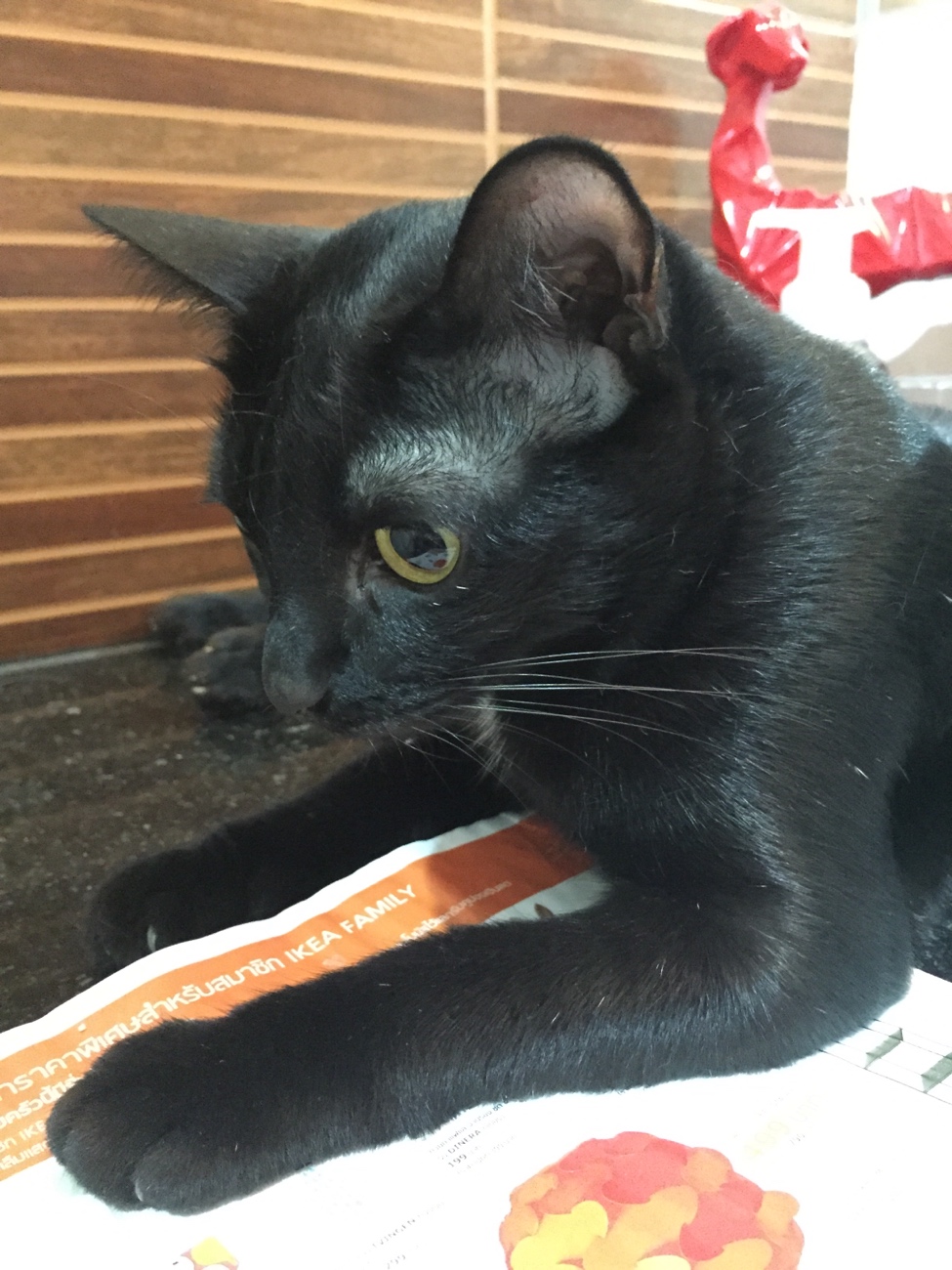 คือแมวอายุ ปีกว่า พึ่งเอามาอยู่บ้านได้ประมาณ ไม่ถึง 10 วัน คุ้นกับบ้านแล้ว ตัวผู้ ตัวใหญ่ ยังไม่สามารถทำหมันได้ เจ้าของต้องการให้มีลูกกับอีกตัวก่อน มีนิสัยแปลกคือ ถ้าผมเข้าห้องน้ำ แล้วออกมา มันจะวิ่ง