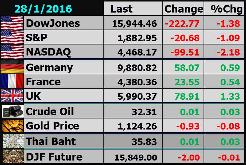 DJIA : ปิดร่วง 390.97 จุด วิตกราคาน้ำมันทรุด,ศก.สหรัฐ-จีนชะลอตัว EU : ปิดร่วง วิตกตลาดหุ้นทั่วโลกดิ่ง,น้ำมันร่วงหนัก น้ำมัน : ปิดร่วง $1.78 วิตกน้ำมันล้นตลาดหากอิหร่านส่งออกเพิ่ม