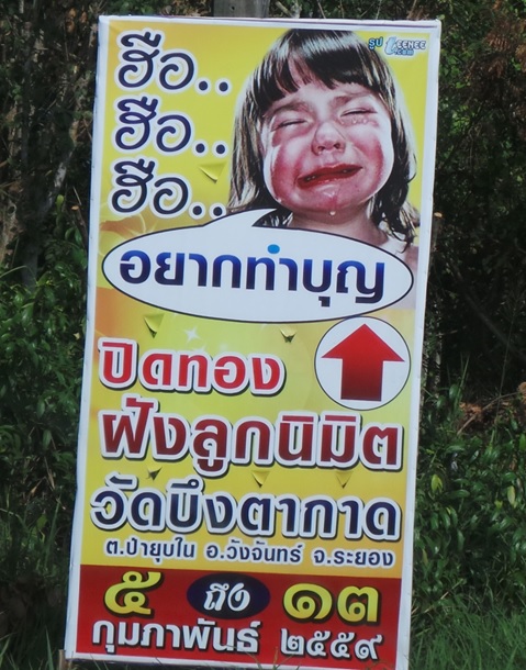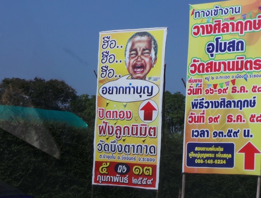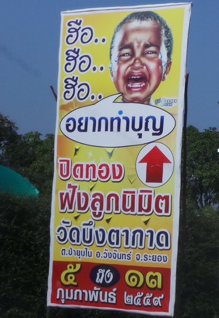 เริ่มจากเมื่อสัปดาห์ที่ผ่านมาได้ขับรถไปทำงานในภาคตะวันออก ได้เจอะเจอกับบางสิ่งที่ขัดหูขัดตามมาตลอดทั้งขาไปและขากลับ จากชลบุรี - ระยอง-จันทบุรีและขากลับ จากจันทบุรี -กทม สิ่งดังกล่าวคือป้ายดึงดูดเข้าร่วมพิธีปิดทองฝังลูกนิมิต ของวัดบึงตากาด อ.วังจันทร์ จ.ระยองตามภาพ
