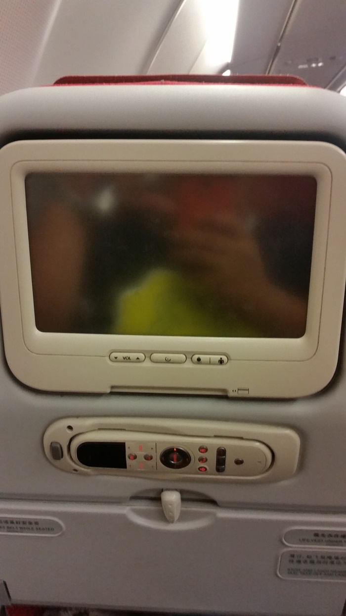ถึงแม้จะราคาถูกก็อย่าให้ใครดูถูก(เกี่ยวกันมะ?) ฮ่องกงแอร์ไลน์นอกจากราคาน่ารักน่าจับต้องแล้ว นางยังมีเครื่องเล่นเหมือนนครชัยแอร์ด้วย(แหม...เปรียบเทียบซะ) จอสารพัดนึก คือนึกอะไรไม่ออกก็กดจอเล่นไว้ก่อนแล้วกัน แต่คราวนี้เราเตรียมตัวมาอย่างดี เรามีแท็บเล็ตที่โหลด The Face Thailand มาแล้วเรียบร้อย อิอิ แต่ขากลับเราก็ดูมินเนี่ยนจากจอนี้นะ ก็เพลินดี จอนี้มันก็มีเพลง มีภาพยนต์ มีรายการTV(ส่วนใหญ่เป็นการท่องเที่ยวฮ่องกง) มีข้อมูลการบินต่างๆ อุณภูมิภายนอก แรงลม ระยะทาง เส้นทาง บลาๆๆ แต่เนื่องจากทั้งไฟล์ไปและกลับเป็นไฟล์ดึก เราจึงได้อาหารแค่ขนมปังกลิ่นประหลาดกับซอฟต์ดริ้งแค่นั้นเอง(รู้สึกไม่คุ้มก็ตรงนี้แหละ แต่ตีสามจะให้เขาเสิร์ฟข้าวหน้าไก่หรือยังไง?ฮ่วย) อ้อ! อย่าลืมขอหมอนจากคุณแอร์ด้วยนะ ส่วนผ้าห่มมีให้ที่ที่นั่ง(อย่านั่งทับจนลืมล่ะ)