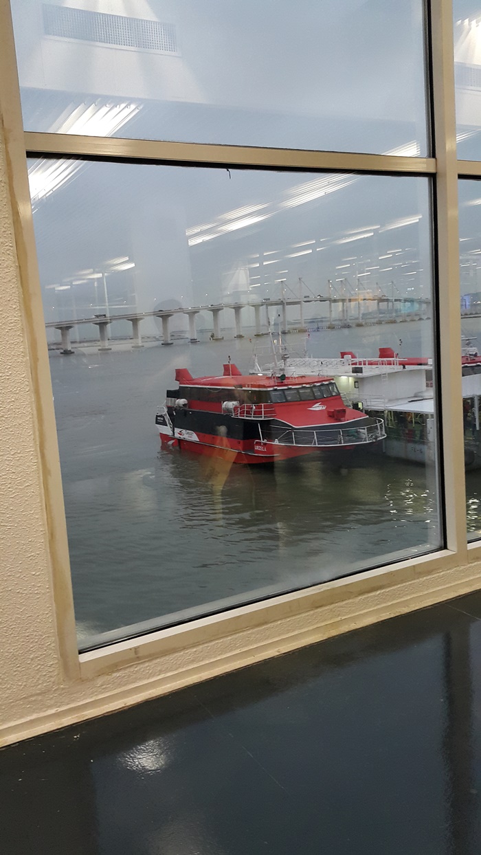 วิวระหว่างนั่งเรือไปมาเก๊า ขออภัยภาพอาจไม่สวย เนื่องจากนั่งอยู่แถวกลางอ๊ะนะ อ้อบนตั๋วเรือเขาจะมีที่นั่งบอกด้วยนะ แต่ตอนซื้อตั๋วเราเลือกที่นั่งไม่ได้ เราจะรู้ที่นั้งก็ตอนเขาเกจไปรอขึ้นเรือ ตรวจด่านตรวจตั๋วเราจะเอาสติกเกอร์ที่นั่งแปะไว้บนเรา เขาก็จะมองๆ ว่ามาด้วยกันเขาก็จะให้นั่งแถวเดียวกันประมาณนั้นอ๊ะนะ