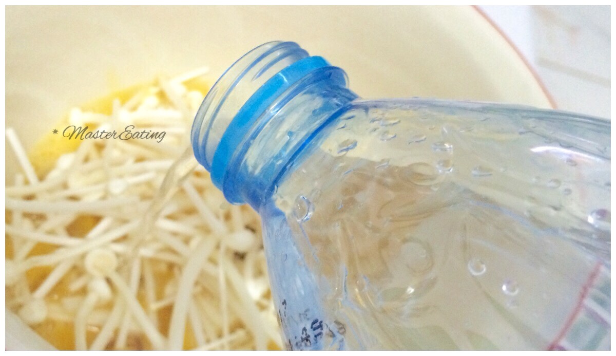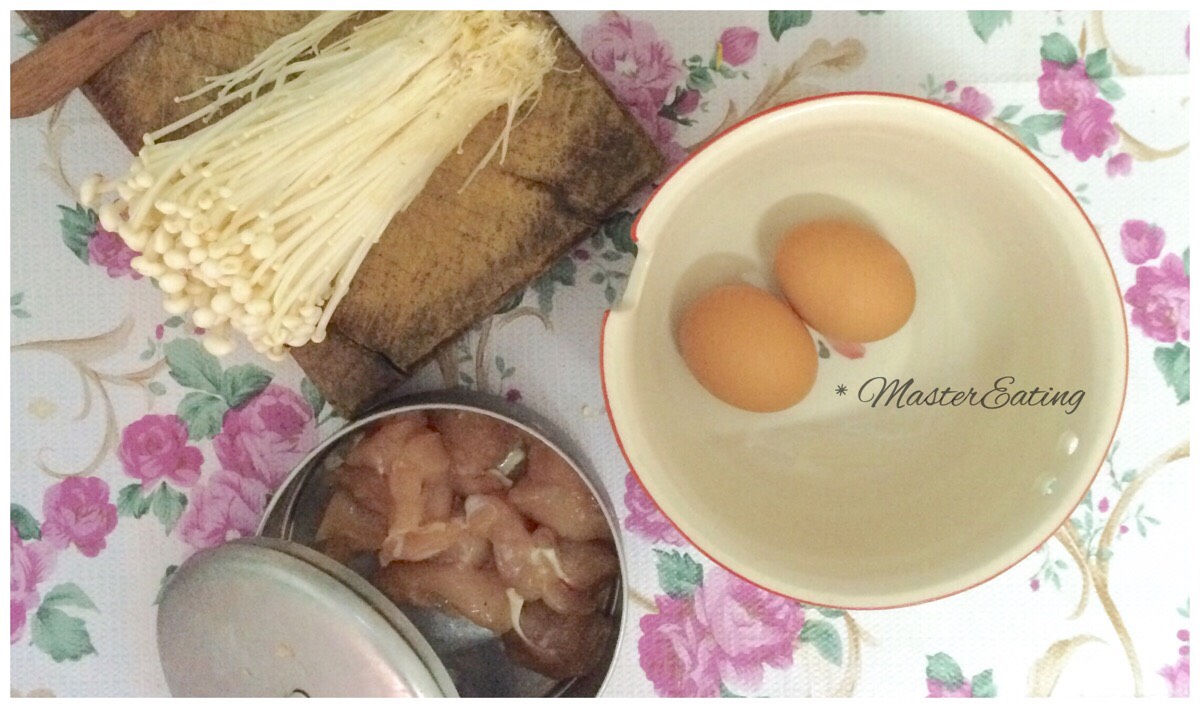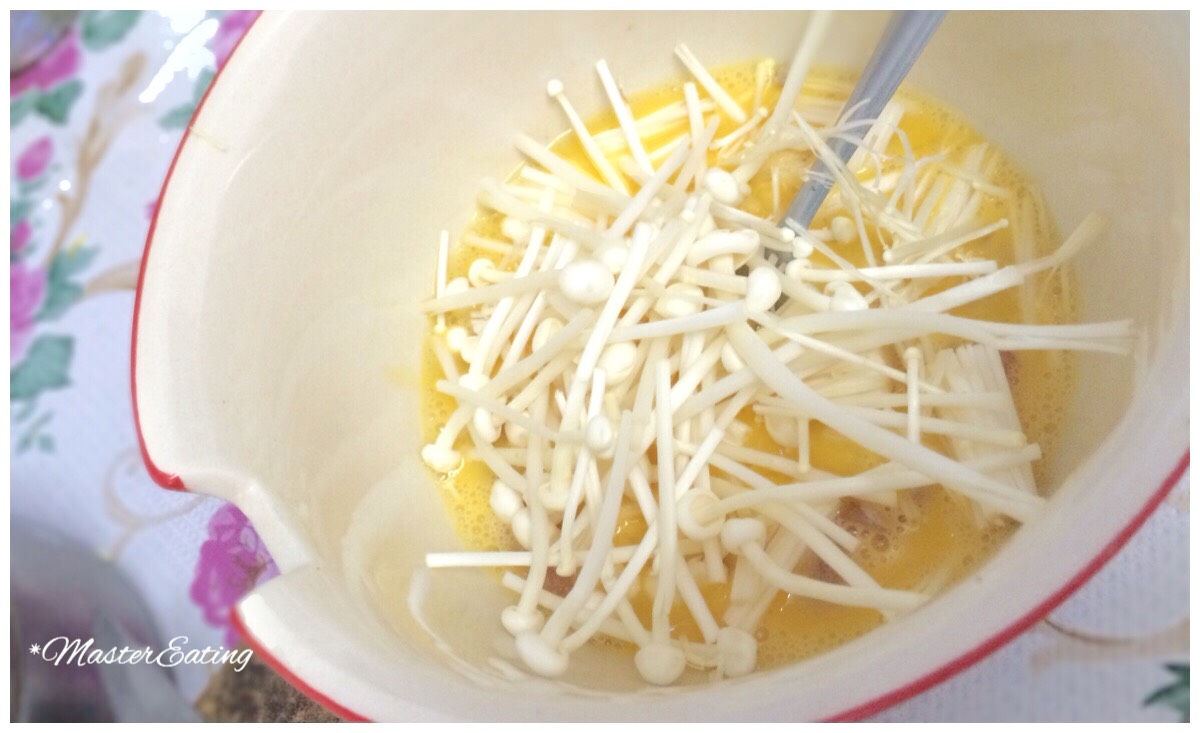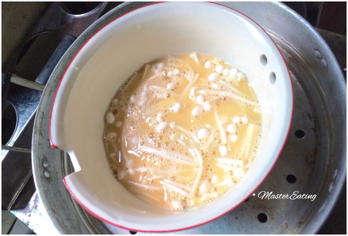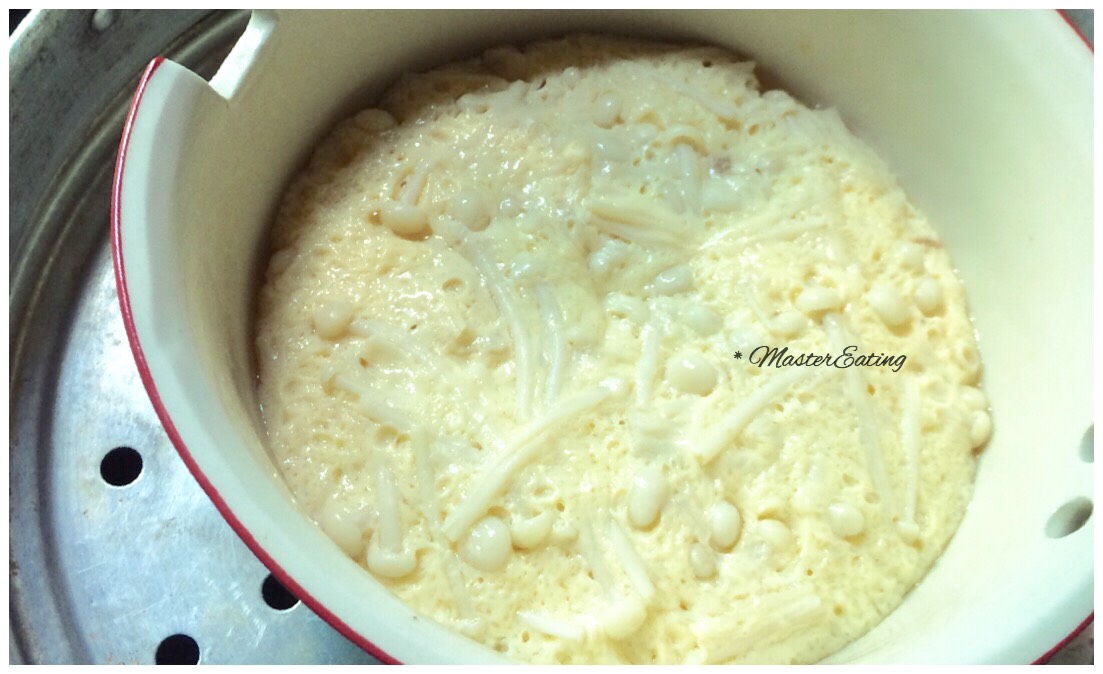 //// โรยเห็ดเข็มทองลงไป ( ฉีก ๆ ) เติมน้ำเปล่าเล็กน้อย เพื่อเวลาเอาไปนึ่งแล้วไข่ตุ๋นจะได้ไม่แห้งเกินไป ///