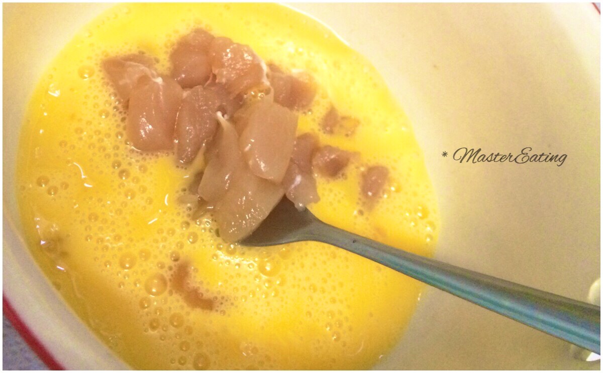 ตอกไข่ทั้งหมดใส่ถ้วยที่ทนความร้อนได้ . . . หั่นไก่ให้ชิ้นเล็กลงนิดนึงแล้วใส่ลงไป