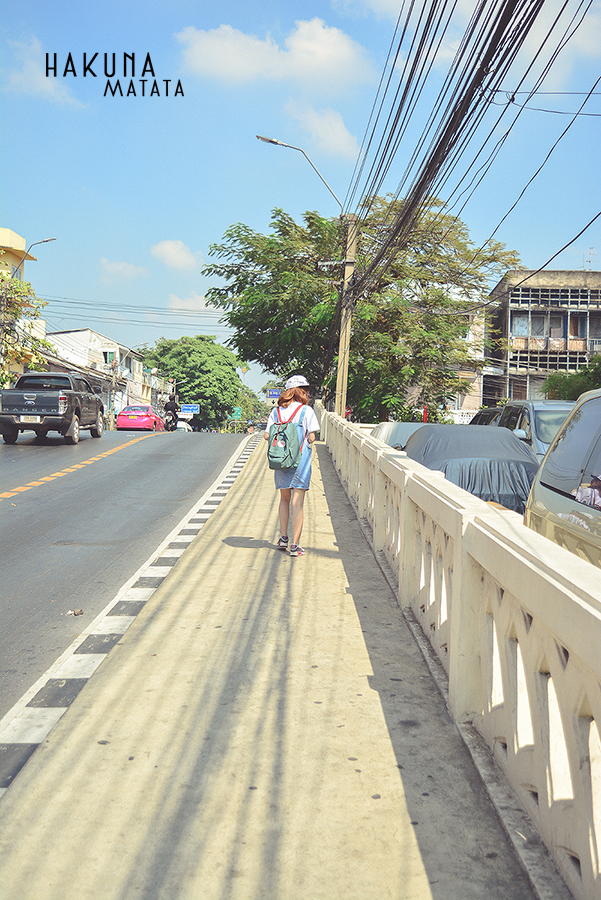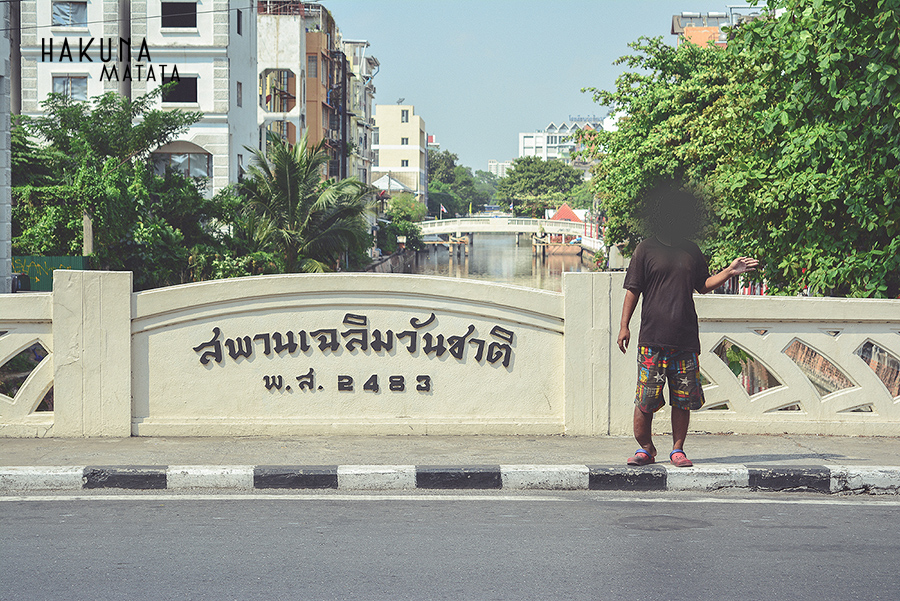 เดินข้ามสะพานเฉลิมวันชาติครับ (“สพานเฉลิมวันชาติ” บนสะพานเขียนงี้อ่ะ!)