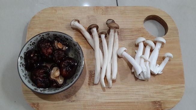 เมื่อหมักได้ที่แล้วเราก็จัดการน้ำมาผสมโรงกับเห็ดสามชนิดที่เราเตรียมไว้เลยค่ะ (สารภาพตามตรงนะคะว่าเห็ดสองอย่างที่อยู่บนเขียงหน่ะ จขกท.ซื้อมาทำกินบ่อยมากค่ะ แต่ว่าไม่รู้ว่ามันคือเห็ดอะไร รู้แค่ว่ามันอร่อยดี แหะๆ ถ้าใครรู้ช่วยบอกด้วยนะคะ ขอบคุณล่วงหน้าค่าาา)