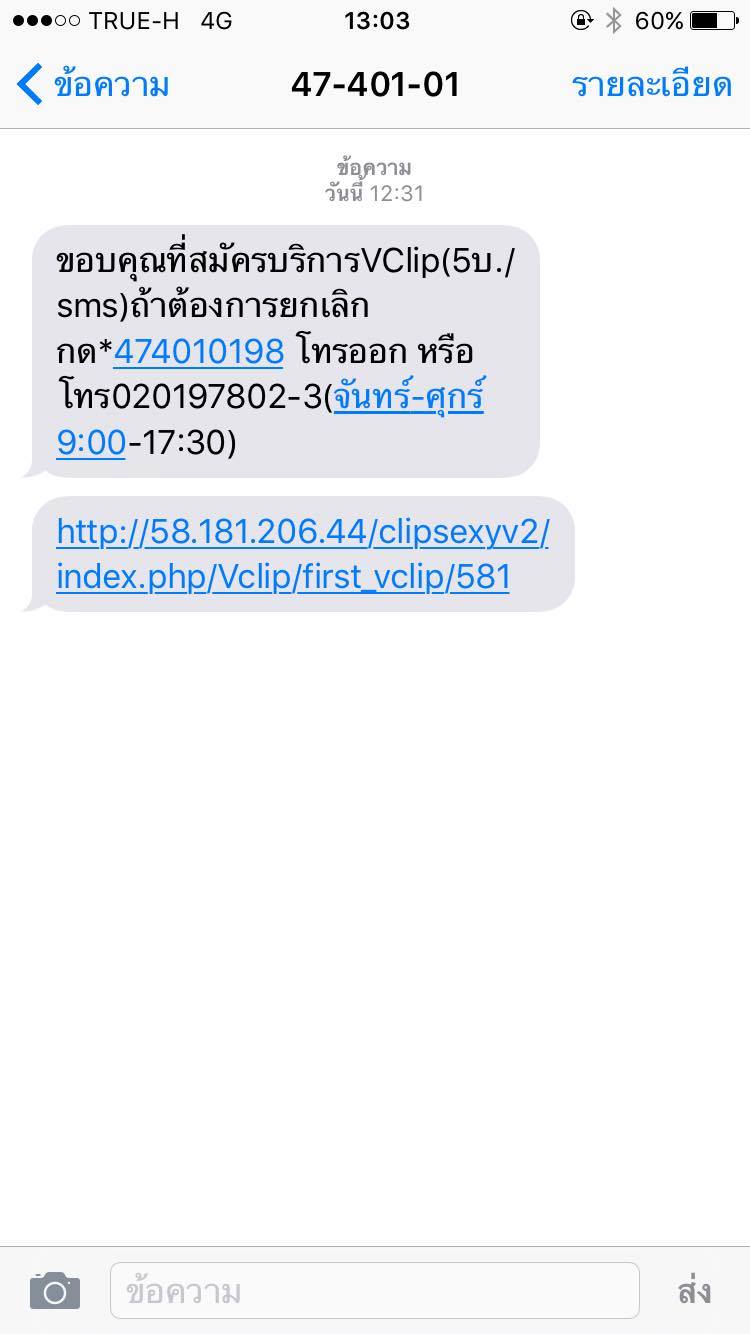 วันนี้ (31 ม.ค. 59) ช่วงเที่ยง ช่วงระหว่างขับรถออกไปทานข้าว อยู่ๆ ก็ได้รับ SMS จาก 4740101 ชมคลิป Clip Sexy เสีย 5 บาท ต่อ SMS รายละเอียดตามภาพ ไม่ทราบว่าระบบสมัครให้ผ่านช่องทางใด๋ เนื่องจากในช่วงเวลานั้นขับรถอยู่ ฉนั้นช่วยยกเลิกบริการ แล้วคืนเงินที่หักไปด้วย