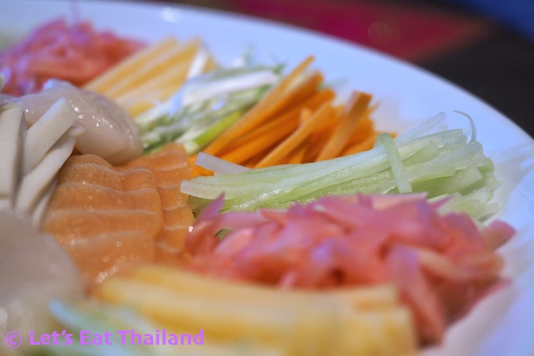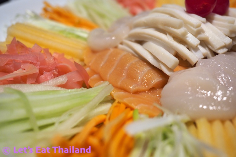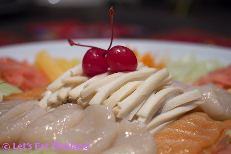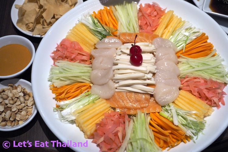 เมนูนี้ มีเป๋าฮื้อ หมายถึงเงินทองที่ใช้ไม่มีวันหมด ส่วนปลาหมายถึงอายุที่ยืนยาวครับ หอยเชลล์ ภาษาจีน จะหมายถึงการมีลูก ใครแต่งงานใหม่ก็สามารถทานเมนูนี้เพื่อมงคล เวลาทานนำมาคลุกเคล้ากัน ภาษาจีน “เรียกว่าโหล-เห (Lo Hei)” คลุกในลักษณะโยน ขึ้นให้ชีวิตเจริญสูงส่งยิ่งๆขึ้นไป