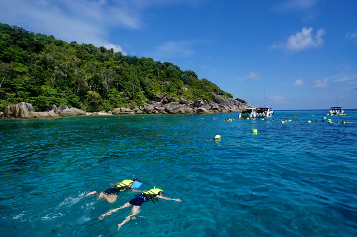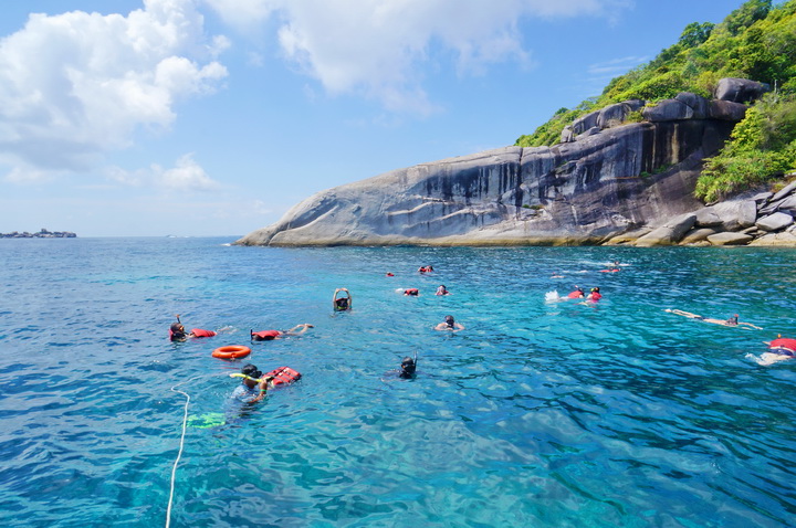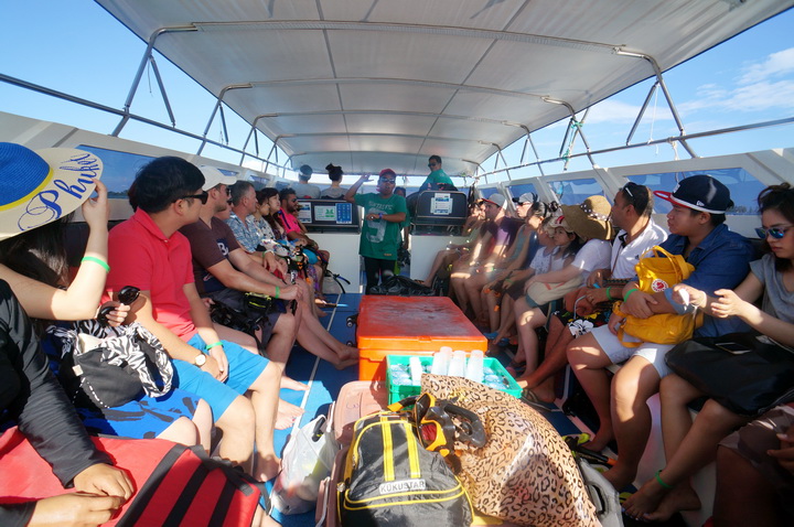 เมื่ออิ่มท้องแล้ว นักท่องเที่ยวก็จะทำการเปลี่ยนเสื้อผ้าเป็นชุดว่ายน้ำกันบนเรือนี่ล่ะ พอสมอเรือถูกหย่อนลง คู่รักชาวเกาหลี ไม่รีรอช้า รีบคว้าสน๊อกเกิ้ล พร้อมกระโดดน้ำกับดาร์ลิ่ง ชมความงามได้ทะเลทันที