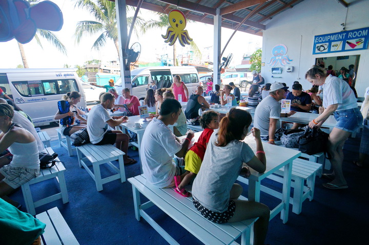 1.ลงชื่อ เพื่อรับ Wristband คล้องแขน เพื่อแยกลูกทัวร์ไม่ให้เกิดความสับสน เช่น สายรัดข้อมูลสีเขียวเดินทางไปยังเกาะสิมิลัน สายรัดข้อมูลสีส้มเดินทางไปยังเกาะตาชัย เป็นต้น ซึ่งช่วงนี้จะเป็นช่วงที่วุ่นวาย และเสียงดังมากๆ เนื่องจากมีลูกทัวร์มาลงอย่างไม่ขาดสาย แต่ก็ได้รับการ Entertain จากพี่ๆ พนักงานที่เป็นสาวประเภทสองทั้งหมด (รับรองว่าได้รับความเป็นกันเอง บวกความฮาตั้งแต่เริ่มทริปกันเลย)
