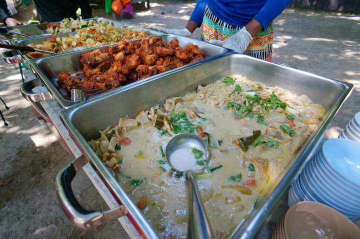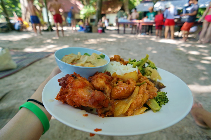 บอกแล้วว่าเลี้ยงดี!! เรือจอดเทียบท่าเกาะแรก อาหารเช้ายังไม่ทันย่อย .. ทัวร์มีจัดเลี้ยงต่อด้วยอาหารกลางวัน ซึ่งจัดเสมือนบุฟเฟต์เล็กๆ ที่มีเมนูมีไก่ทอด แกงข่าไก่ ผัดผัก ปลาเปรี้ยวหวาน