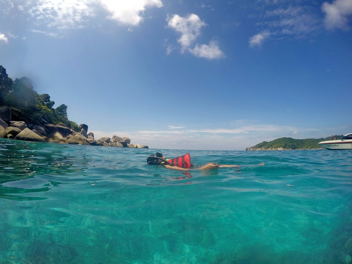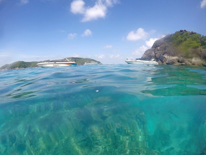 ส่วนใครที่ยังอยากเก็บตกรูปภาพท้องฟ้า เรือพร้อมเส้นขอบฟ้าสวยๆ แนะนำว่าก็อย่าเพิ่งเปลี่ยนชุดแล้วกระโดดตูมจนตัวเปียกปอนนะคะ ให้รอช่วงจังหวะที่นักท่องเที่ยวทยอยลงน้ำ จนเรือโล่ง ให้เราเดินไปทางหัวเรือ เพื่อเก็บตกรูปตัวเองในสภาพที่ยังสวยอยู่ (ก่อนลงน้ำ ) หรือจะค่อยลงน้ำจุดที่สองตอนเรือแวะไปเกาะเจ็ดก็ได้ค่ะ ปะการังสวยเหมือนกัน