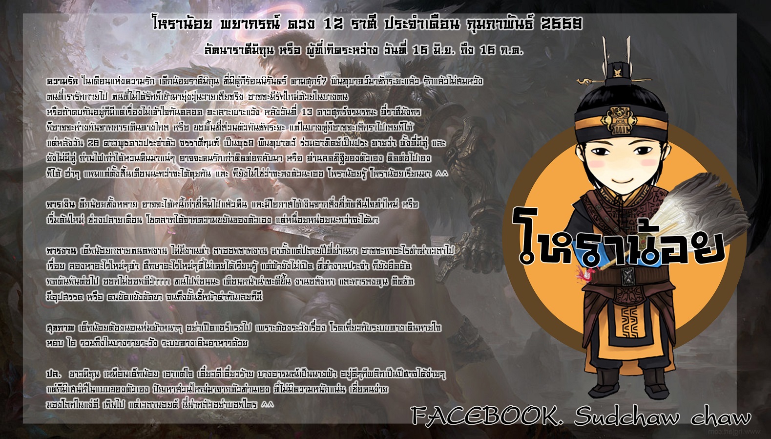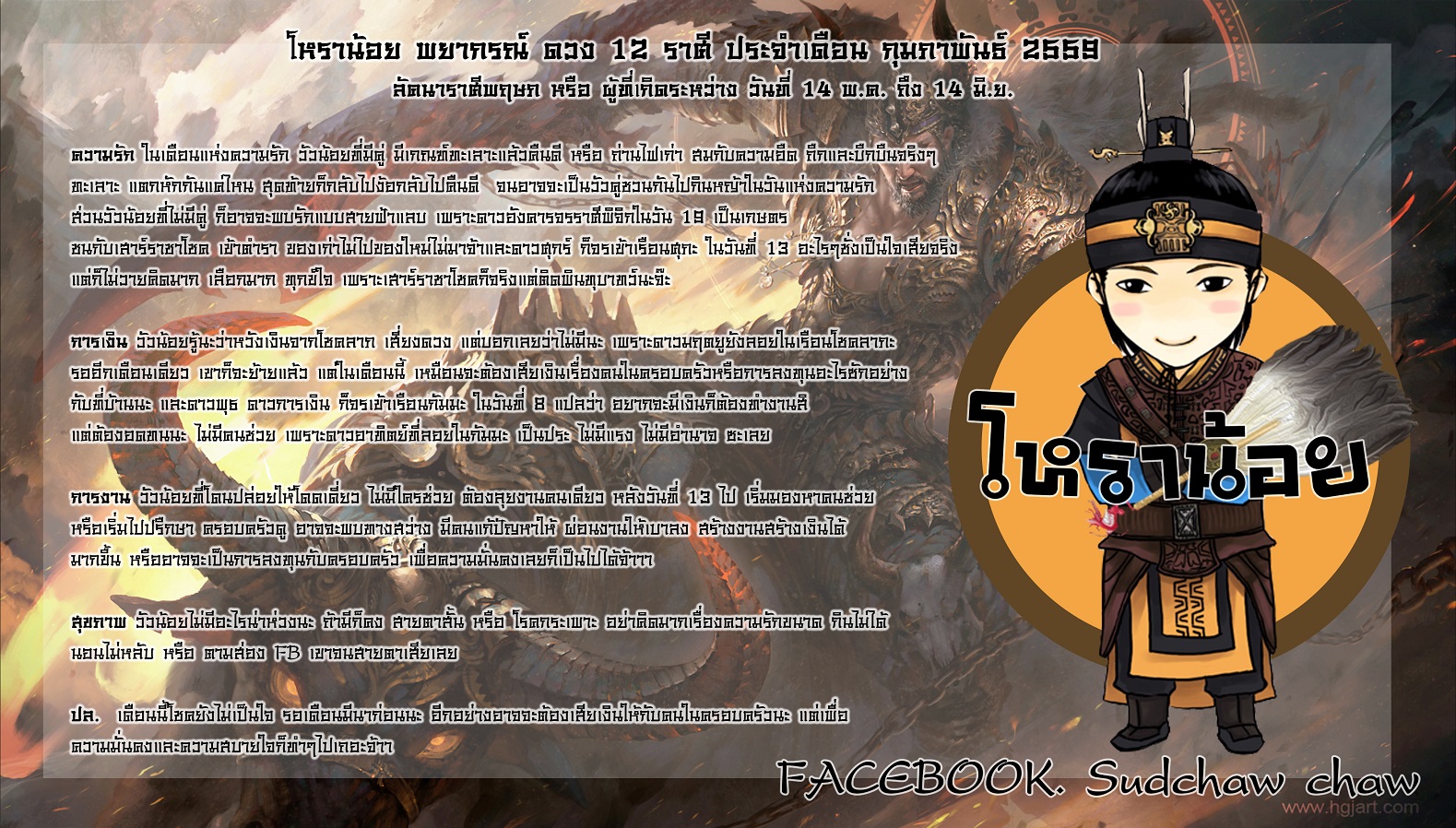ปล. เดือนนี้โชคยังไม่เป็นใจ รอเดือนมีนาก่อนนะ อีกอย่างอาจจะต้องเสียเงินให้กับคนในครอบครัวนะ แต่เพื่อ