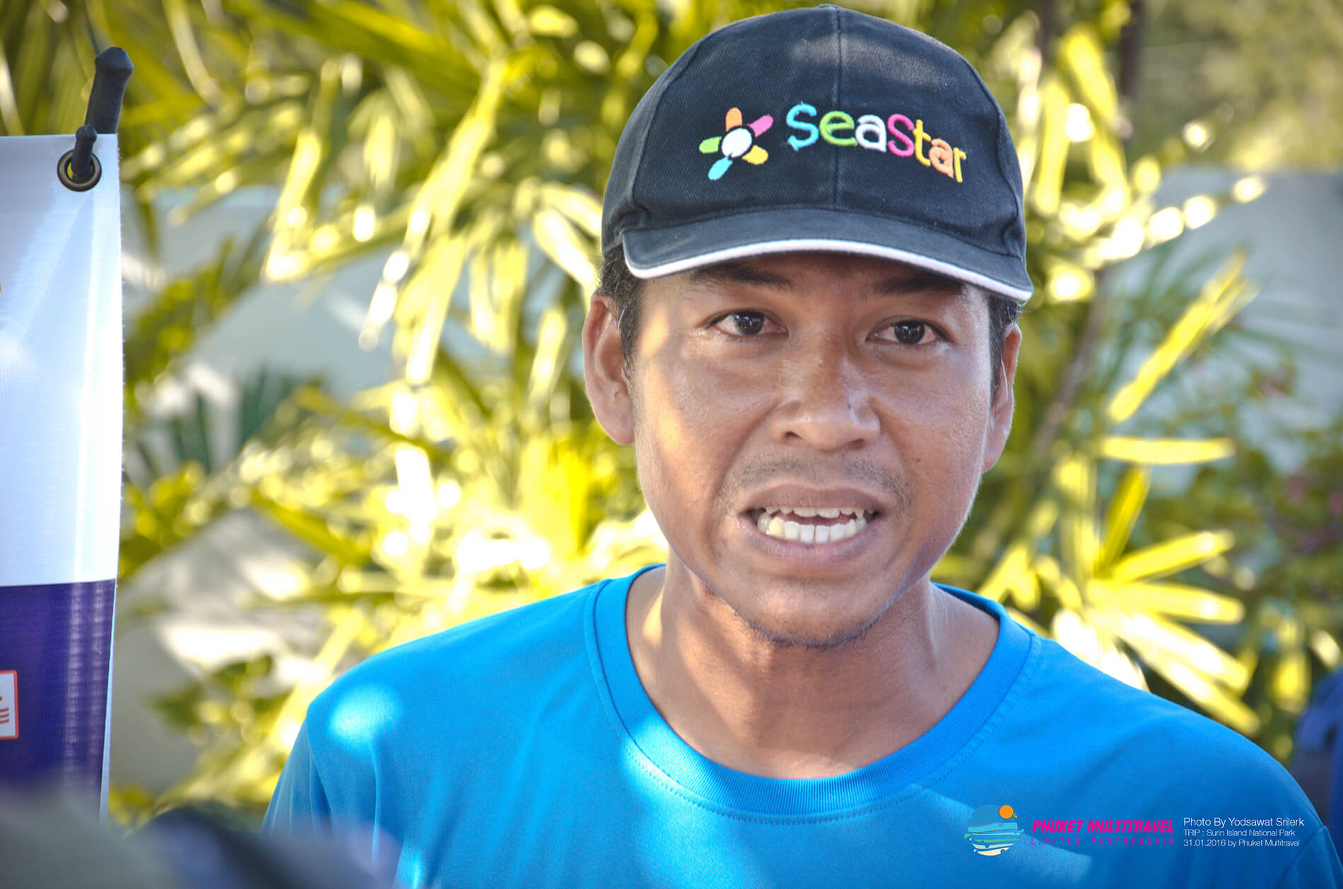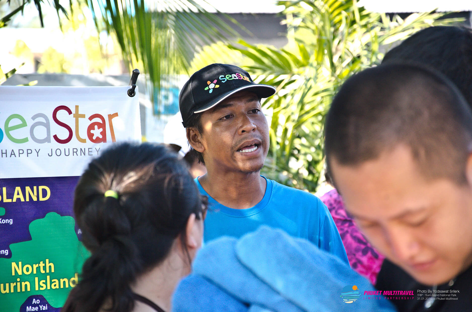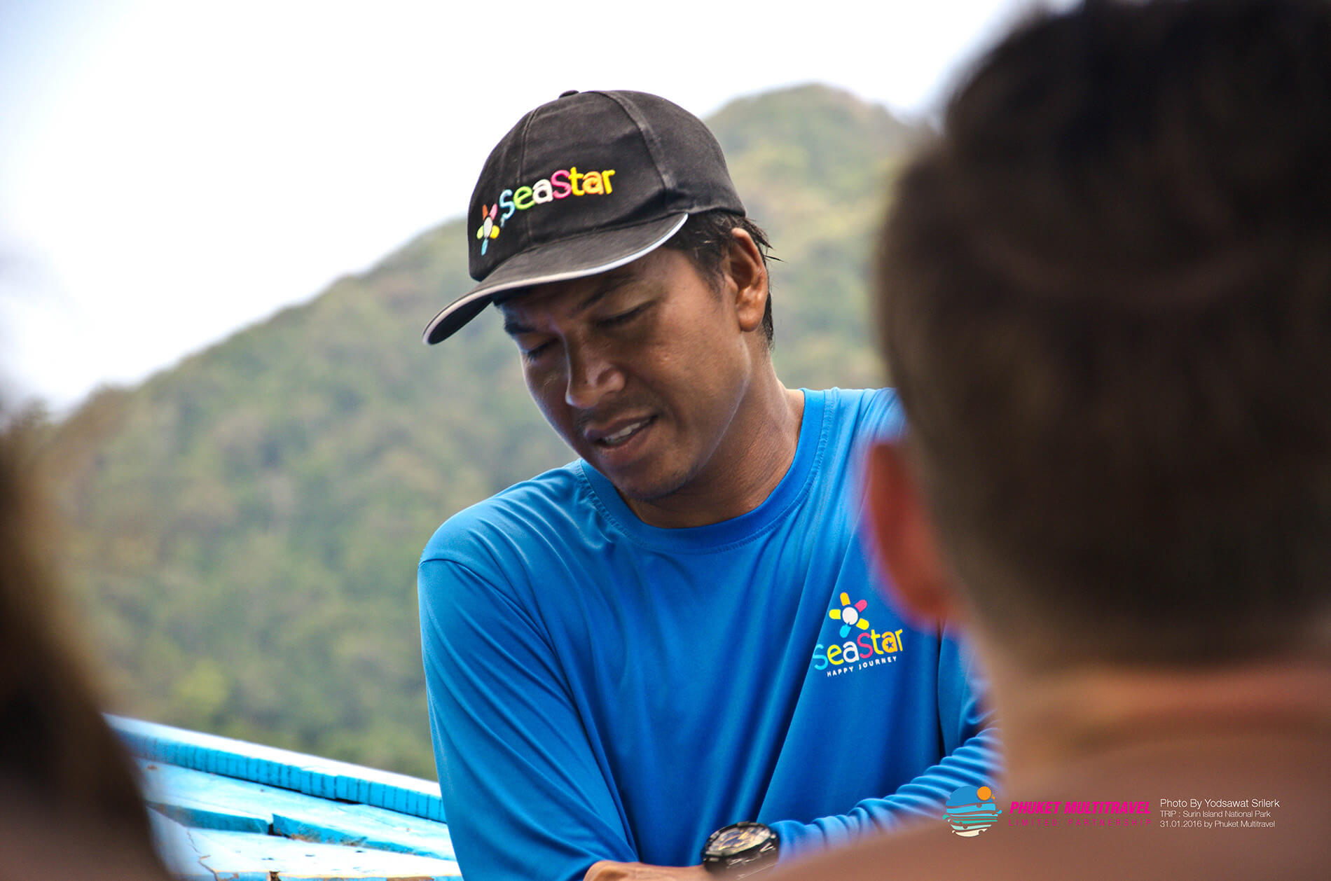พี่แดนนี่ ไกด์ประจำทริปนี้ของเรา พี่เขาก็กำลังอธิบายรายละเอียดในการแวะดำน้ำ ดูปะการัง อะไรไปเรื่อย... เราก็ใช้เพื่อนจำครับ เพราะเราแฮ้งค์ 55