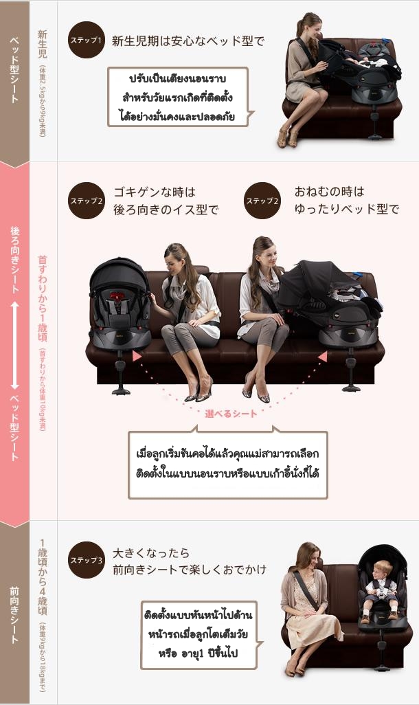 -คาร์ซีทแบบ 3 Step สามารถปรับเป็นเตียงนอน/ ปรับเป็นเก้าอี้นั่งหันหน้าเข้าเบาะ/ หันหน้าออกจากเบาะได้