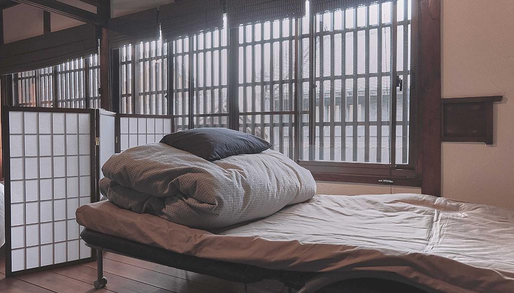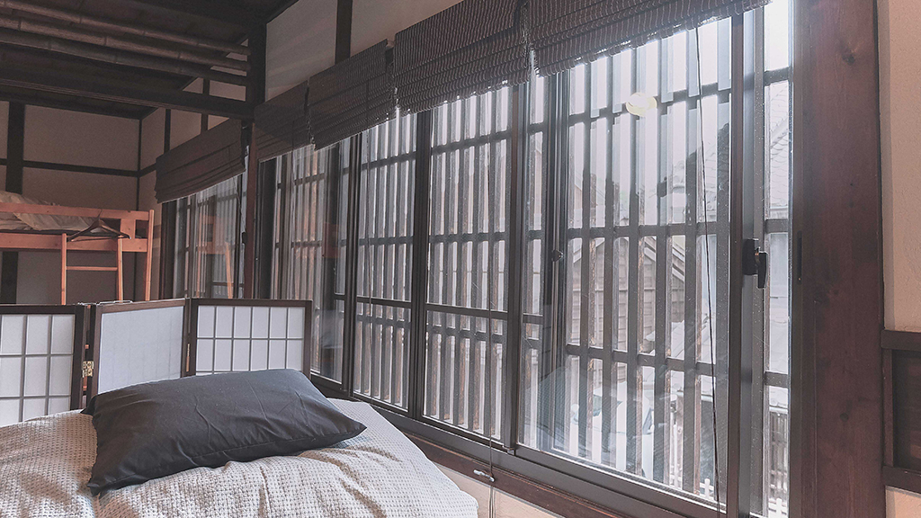 ทันทีที่ขึ้นไปถึงตัวบ้านชั้นบน เราก็พบกับห้องนอนสไตล์ญี่ปุ่นโบราณตามที่คิดไว้ ทั้งประตูบานเลื่อนและฉากกั้นล้วนแต่ให้ความรู้สึกในการใช้ชีวิตแบบดั้งเดิมอย่างแท้จริง แม้จะมาผิดหวังอยู่เล็กน้อยกับการแบ่งสัดส่วนห้องนอนที่ไม่ได้ให้ความรู้สึกเป็นส่วนตัวเท่าไหร่นักเมื่อเทียบกับที่คิดไว้ เตียงนอนสองชั้นหนึ่งเตียงและฟูกนอนแบบเดี่ยวๆอีกสามอัน ถูกจัดวางอยู่ใกล้ๆกัน โดยมีฉากไม้เล็กกั้นบริเวณหัวนอนเพื่อความเป็นสัดส่วนของลูกค้าที่มาพักเท่านั้น แต่ความสูงของฉากก็ดูเตี้ยจนเกินไป เพราะหากเรานั่ง ก็จะสามารถมองเห็นคนที่นอนอยู่ฟูกข้างๆได้ชัดเจน แต่มันก็ไม่ได้เป็นปัญหาสำหรับการนอนพักคืนนี้เท่าไหร่นักเมื่อเทียบกับบรรยากาศและวิวโดยรอบที่ได้มาพักผ่อน กระเป๋าสัมภาระถูกเคลื่อนย้ายมาจัดวางตามตำแหน่งที่นอนของแต่ละคน โดยเรื่องที่ต้องระมัดระวังขึ้นมาอีกหน่อยก็คงเป็นเรื่องเสียง เพราะนอกจากจะต้องทำอะไรให้เบามือแล้ว เนื่องจากที่พักของเราอยู่ชั้นบนของบ้าน เวลาเดินคงต้องเดินให้เบาที่สุดเพื่อไม่ให้เป็นการรบกวนคนที่อยู่ชั้นล่าง บวกกับโครงสร้างของบ้านเป็นบ้านไม้สมัยโบราณ ถ้าจะให้ดีคงต้องเปลี่ยนจากเดินมาเป็นย่องเสียมากกว่า