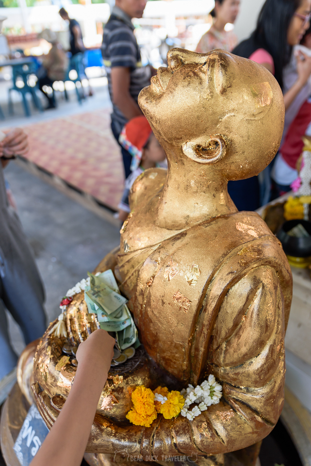 ป้ายที่สองคือวัดไผ่ล้อม ที่นี่มีรูปปั้นพระท่าทางแปลกๆ อยู่องค์หนึ่ง ถามคุณยายที่นั่งเฝ้าตู้บริจาคอยู่ ได้ความว่า นั่นคือพระอุปคุต ตำนานเล่าว่า หลังจากที่พระอุปคุตขึ้นมาจากทะเล และปราบมารเรียบร้อยแล้ว ก็เงยหน้าขึ้นมองฟ้าเพื่อดูเวลา ถ้าพระอาทิตย์เลยหัวไปแล้วจะได้ไม่ฉัน