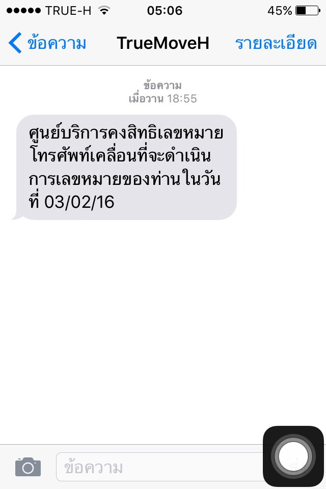 - ไปทำเรื่องย้ายค่ายเบอร์เดิมที่ true สาขา เซ็นทรัลปิ่นเกล้ามาเมื่อวันศุกร์ที่ 11 มีค. 59 จนท. true แจ้งว่าประมาณ 2-3 วันทำการน่าจะย้ายค่ายได้สำเร็จ -เมื่อวาน 15 ม๊.ค. 59 ได้รับ SMS จาก AIS แจ้งว่าจะ