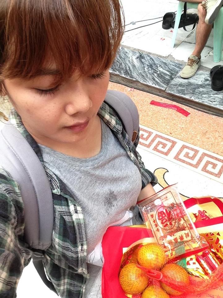 เราก็เดินไปซื้อใบแก้ปีชงมาเขียนชื่อๆ แต่ของไหว้ที่ซื้อมาก็ยังไงไม่ได้ไหว้นะ เยอะแยะเต็มมือไปหมด เราก็กำลังงงกับอายุตัวเองอยู่เพราะในปฏิทินจีนเทียบ พ.ศ. กับอายุ มันไม่เท่าอายุเราตอนนี้ เราก็ทำหน้างงๆ จ้า เลยหันไปมองพี่ๆ กรุ๊ปข้างๆ เค้าทำยังไงกันเขียนแบบไหนเลยเขียนตามเค้า เลยเดินตามเค้าไปทำตามเค้าเลย แต่ทว่าด้วยความที่คนเยอะมาก เราก็มองไปมองมาหาเค้าไม่เจอแล้ว แต่เจอน้องผู้ชายคนนึง พอเค้าเห็นเราทำหน้างงๆ ยืนถือ ทั้งของไหว้ทั้งกระดาษแก้ปีชงเต็มไปหมดเลยบอกว่าเราทำยังไง