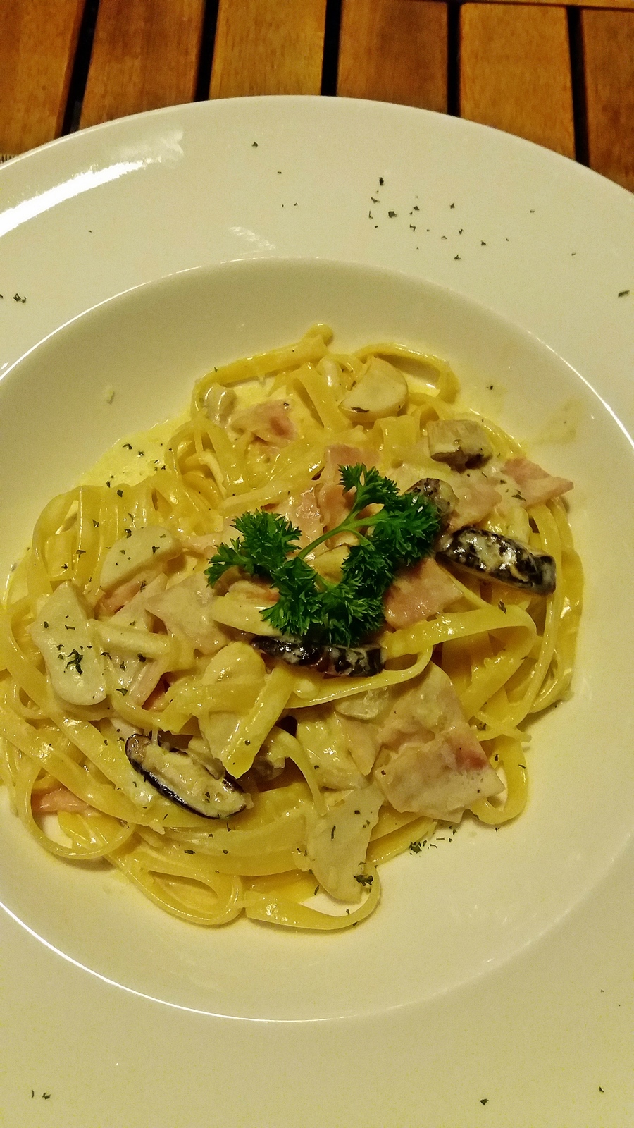 ตามด้วย เฟตูชินี่คาโบนาร่าแฮมและเห็ด