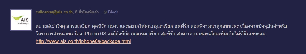 สุดท้ายแค่อยากจะบอกว่า อย่าซ้ำเติมคนเครื่องหายเลย เพราะเราก็ไม่ได้มีเวลามานั่งรถตามหา 5s สาขานู้นสาขานี้หรอก ต้องเอาเวลาไปทำมาหากินเหมือนกัน ส่วนจะซื้อ 6s มันก็เกินงบ เงินก็ต้องเอาไว้กิน ไว้ทำอย่างอื่นด้วย ไม่ได้เอามาไว้ซื้อโทรศัพท์อย่างเดียว สรุปถ้าค่ายอื่นมี แล้วเราไม่มีก็ปล่อยลูกค้าไปเหอะ อย่าไปดึงไว้เลย ทำให้หงุดหงิดกันเปล่าๆ