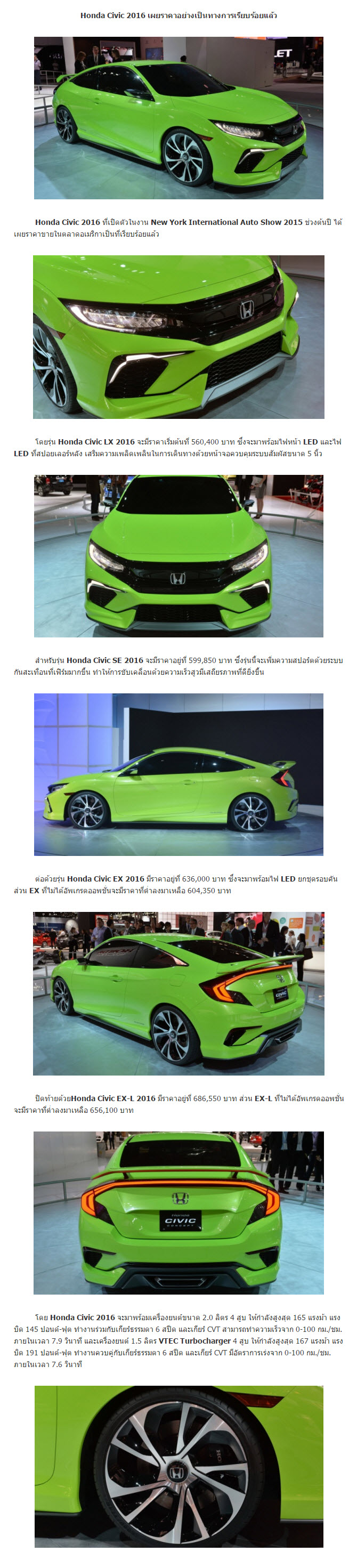 ตามข่าวนี้นะครับ เห็นว่า Civic ปี 2016 เปิดตัวมาสีเขียวก็น่าสนใจดี แต่เห็นหลายท่านพูดถึงราคากัน เพราะเป็นตัวที่มีคนสนใจกันมาก คิดว่ามันจะเป็นรถสปอตราคาถูก เห็นราคาต่างประเทศก็ถูกจริง พอเข้าไทยนี้สิจ