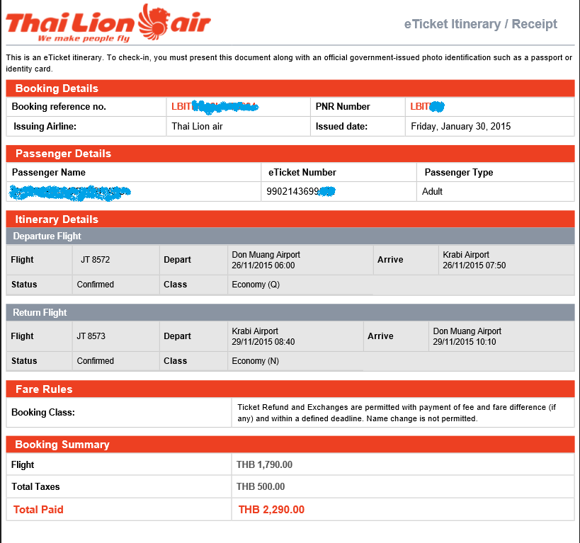 30 ม.ค. 58 : ผมจองตั๋วเครื่องบิน สายการบินหนึ่ง ดอนเมือง-กระบี่ (ไป 25 พ.ย. 58 กลับ 29 พ.ย. 58) ในราคา 2,290 บาท