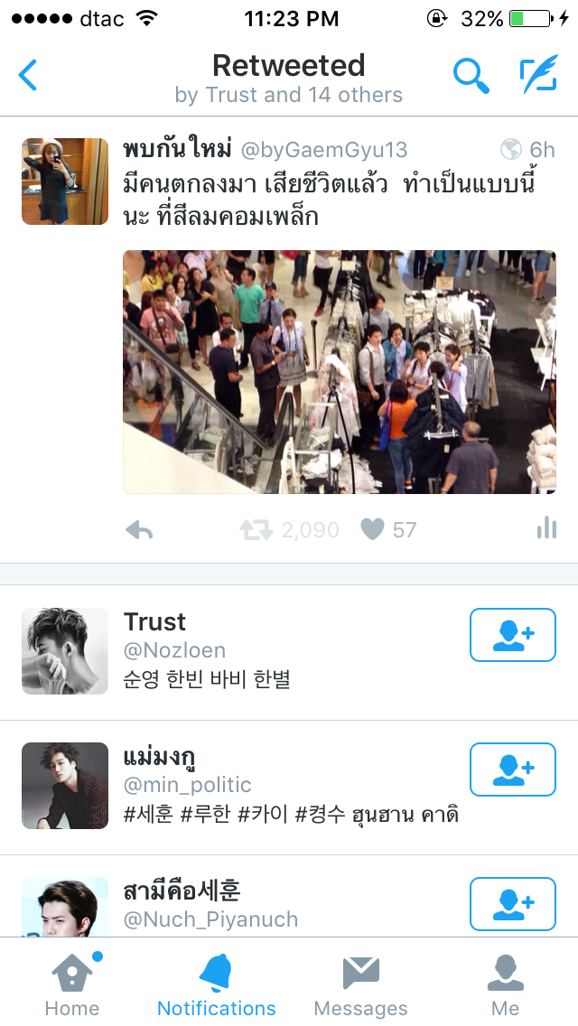 ที่กระโดดจากชั้น5ของห้างลงมาชั้น1 เลยถ่ายลงทวิตเตอร์ จากนั้นมีคนรีทวิตมากมาย แล้วก็หลังจากนั้นก็มีเว็บเอาภาพเราไปลงโดยไม่ให้เครดิตเรา
