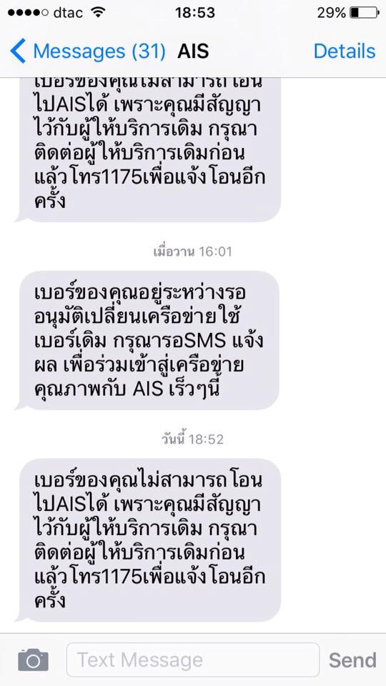 แล้วามาทำเรื่องย้ายเครือข่ายกับ Ais เจ้าหน้าที่บอกว่าระยะเวลาดำเนินการใช้เวลา 3วันทำการ พอมาถึงวันอังคาร มีข้อความเข้าว่า "เบอร์ของคุณไม่สามารถโอนไป Ais ได้ เพราะมีสัญญาไว้กับผู้ให้บริการเดิม" ผมจึงโทรไปหาDtac ให้เจ้าหน้าที่ตรวจสอบ เจ้าหน้าที่ยืนยันว่าไม่มีสัญญาติดค้าง ผมก็โทรไปบอกทาง Ais ว่า โทรไปหาDtacมาแล้วเค้าบอกว่าไม่มีสัญญาติดค้างให้ดำเนินการย้ายเครือข่ายได้ เจ้าหน้าที่ก็บอกว่าจะดำเนินการให้ แต่ต้องเริ่มนับ1ใหม่ ซึ้งต้องรออีก 3 วันทำการ ผมก็โอเค และก็มีข้อความมาว่า "เบอร์ของคุณอยู่ระหว่างรออนุมัติ...." แต่พอมาเมื่อวานวันพฤหัส ก็มีข้อความแบบเดิมมาอีก ว่าผมติดสัญญากับผู้ให้บริการเดิม ซึ้งผมก็โทรไปหาDtac ทางDtacก็บอกว่าไม่มีสัญญาติดค้าง ผมจึงโทรไปยืนยันกับทาง Ais อีกรอบ เจ้าหน้าที่ก็รับเรื่องไว้และจะดำเนินการให้ ผมอยากรู้ว่าในเมื่อ Dtac ยืนยันว่าไม่มีสัญญาติดค้าง ทำไมถึงย้ายเครื่อข่ายไม่ได้ และไม่ได้เป็นรอบเดียว เป็นมา2รอบ และผมก็โทรสอบถามกับDtac และโทรยืนยันกับAis ทั้งสอบรอบ รบกวนเจ้าหน้าทั้ง2เครื่องข่ายตรวจสอบให้ด้วยครับ
