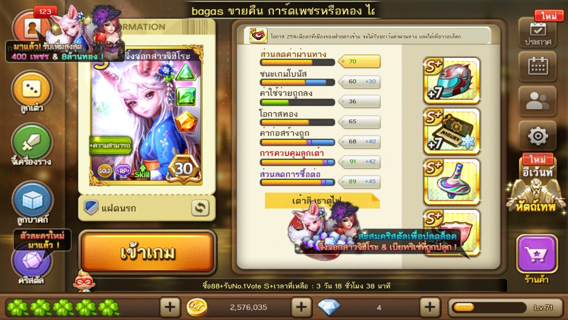 ต่อให้จี้เทพการ์ดเทพขนาดไหน ระบบเกมมันจะไม่ยอมให้เราชนะติดต่อกันจนกำไร เมื่อเราชนะจนกำไรระบบมันจะไปอวยอีกฝั่ง ให้เรากลับมาแพ้ คิดดูชนะได้กำไร60แพ้ขาดทุน100 ทุเรศมาก ปัจจุบัน ผมเองการ์ดเทพจี้เทพอัญมณีเทพสุดเท่าที่จะเทพได้ คิดว่าค่าสถานะต่างๆสูงสุดละ ยังไม่กำไรจากแพลตินั่มเลย เพื่อนๆคิดเหมือนกันไหม ผมสงสัยคนรีวิวเกมในยูทูปตะลุยห้องแพลตเขาเล่นยังไงให้กำไรได้ ภาพด้านล่างคือจี้กับการ์ดผม