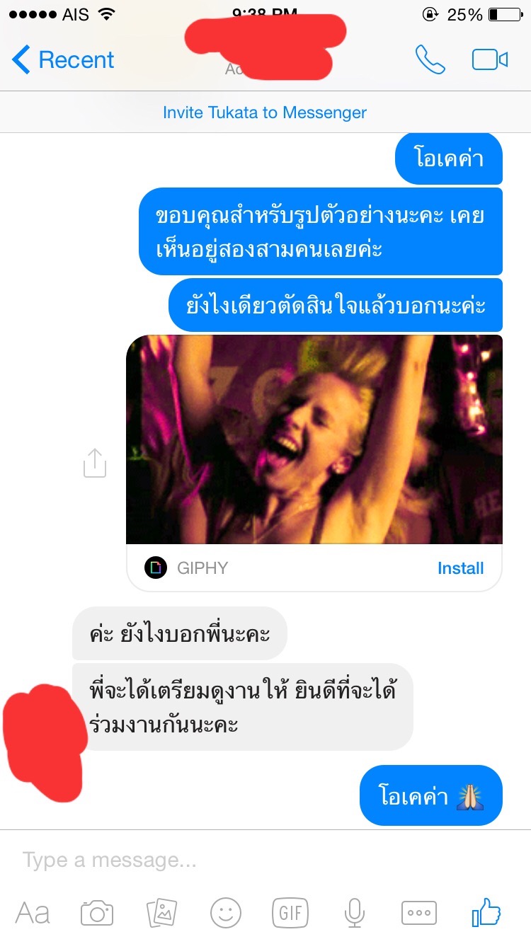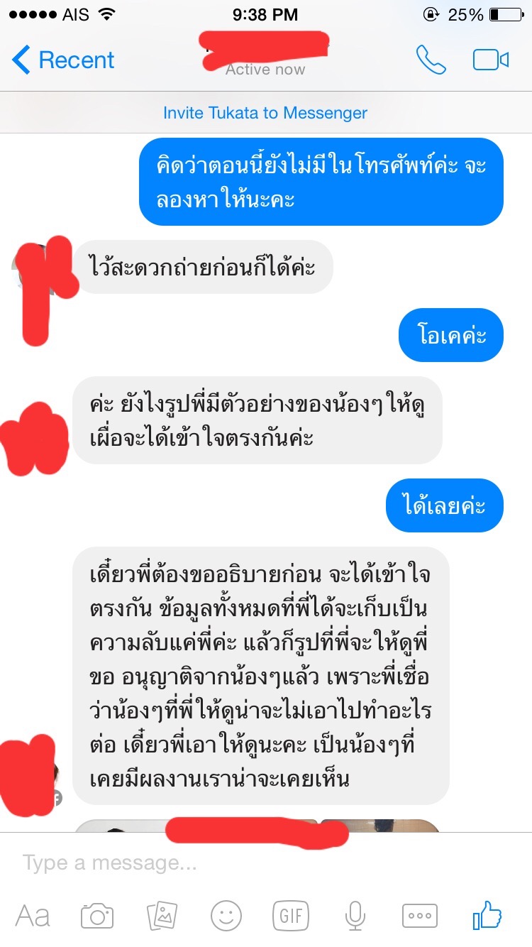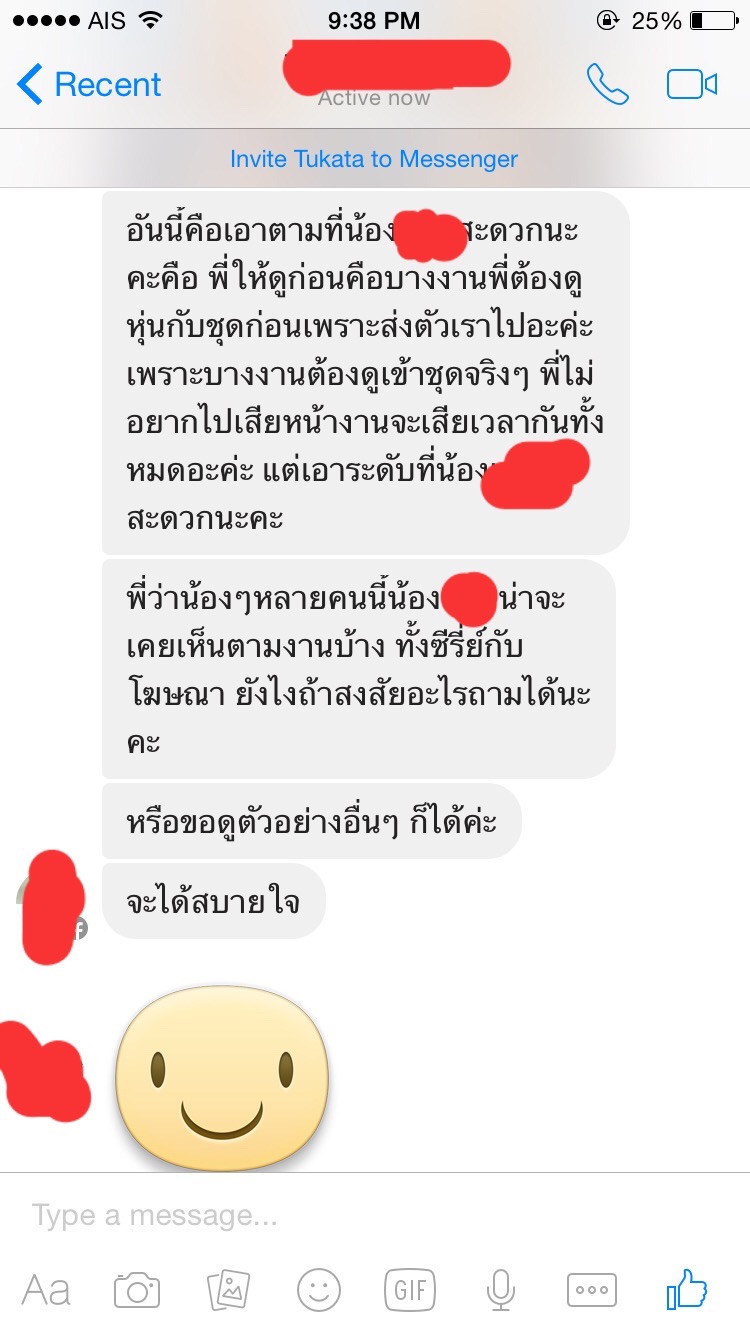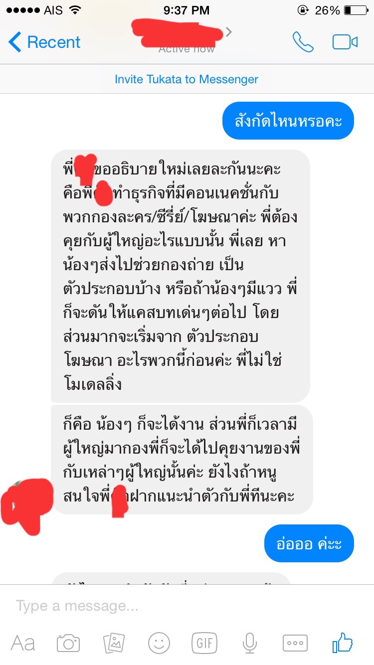 เราเริ่มคิดว่าเอาล่ะ มันไม่ใช่ล่ะ เราจึงบอกเขาว่าขอคิดก่อนนะคะ ละไปปรึกษาพี่คนนึงที่ไว้ใจได่ แล้วก็อยู่ในวงการพวกนี้ พี่เขาบอกเลยว่าคนทำงานเขาไม่ทำกันแบบนี้ คือว่าง่ายๆเขามาหลอกเอารูปเราไปทำอะไรก็ไม่รู้