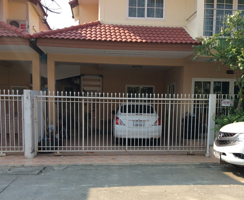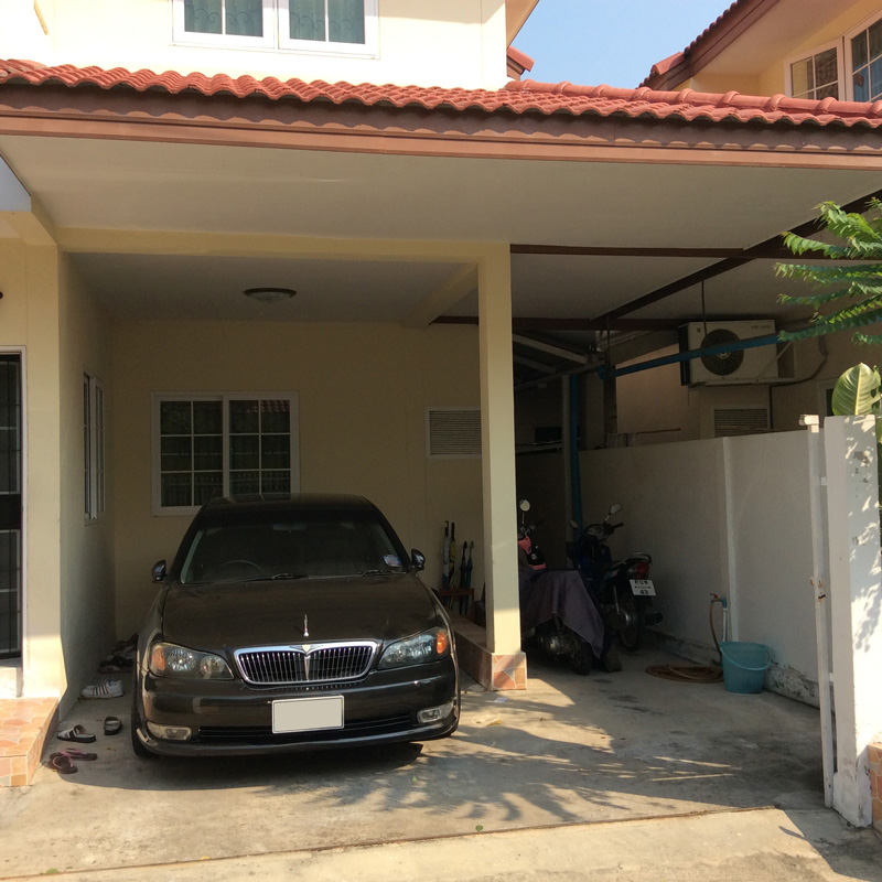 เป็นหมู่บ้านจัดสรรมีพื้นที่เหลือในบริเวณบ้าน จะลงทำโรงจอดรถแยกกับตัวบ้าน ลงเสาเทพื้นทำหลังคาแยกกับตัวบ้าน ชิดกำแพงด้านข้าง แต่บนหลังคาจะเทพื้นคอนกรีตแล้วกั้นลูกกรงกันตก ทำบันไดขึ้นไปใช้สอยพื้นที่บนหลั