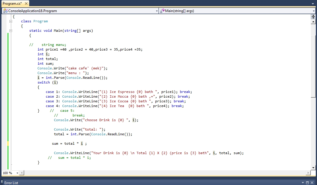 ให้เขียนโปรแกรมคำนวณเมนูเครื่องดื่มและราคาด้วยคำสั่ง switch case