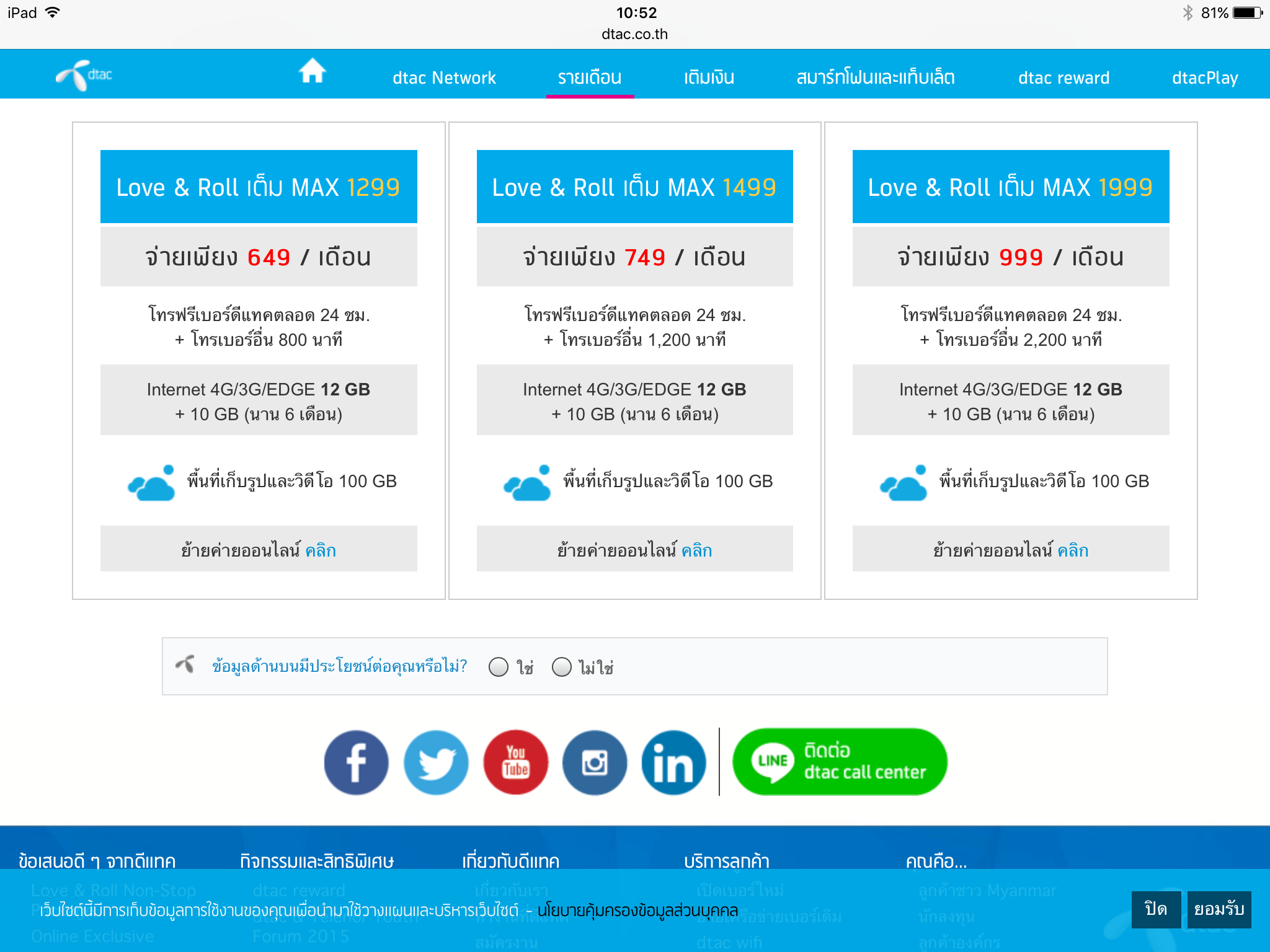 คือผมใช้AISอยู่ และพอดีผมไปส่งแฟนจ่ายค่าโทรศัพท์ที่DTAC เจอโปรตัวนี้น่าสนใจมากครับ Love & Roll เต็ม MAX 1299จ่าย ครึ่งราคาถ้าย้ายค่าย จ่ายเพียง 649 / เดือน โทรฟรีเบอร์ดีแทคตลอด 24 ชม.+ โทรเบอร์อื่น 800 นาทีInternet 22GB=12 GB+ 10 GB คือผมทำงานที่ระยองอยู่มาบตาพุด อยากทราบว่าสัญญาณของDTACเป็นอย่างไรบ้างครับคือใช้AISอยู่สัญญาณก็ไม่ค่อยจะแรงมี2ขีดเองเฉลี่ย (ที่ทำงานผมอยู่ถนนไอหนึ่ง) กลัวว่าถ้าย้ายไปสัญญาณจะแย่กว่าครับ อยากสอบถามว่าDTAC สัญญาณดีไหมครับที่มาบตาพุด ระยอง
