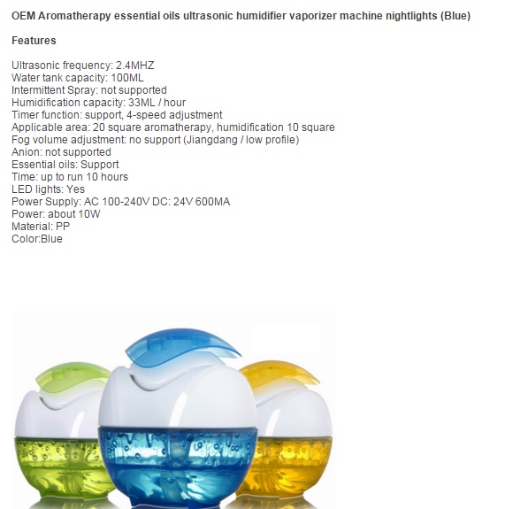 รุ่น : Aromatherapy essential oils ultrasonic humidifier vaporizer machine nightlights (Blue)