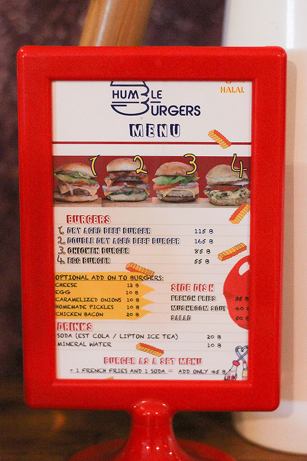 Humble Burgers เป็นร้านเล็ก ๆ บนถนนสนามบินน้ำเกือบถึงแยกสนามบินน้ำ (แถว ๆ ซอยติวานนท์ 27) บรรยากาศร้านจะเหมือนมานั่งกินข้าวบ้านเพื่อน แอบมองแม่ครัวทำอาหารได้ด้วย สำหรับภาพหน้าร้านต้องขอโทษที่ไม่ได้ถ่ายมานะคะ หน้าร้านจะดูมืดหน่อย แต่มีจุดสังเกตเป็นร้านขายจักรยานสีส้มแปร๋นกับป้ายร้านสูททรงสมัยที่อยู่บนตึกแถวนั้นค่ะ ถ้าเจอสองจุดสังเกตนี้ก็แปลว่าเจอร้านแล้วค่ะ