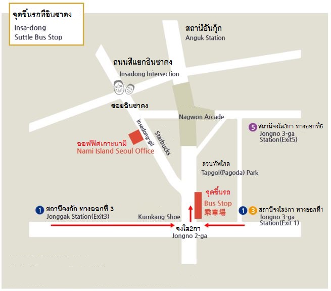 ออฟฟิศ : Nami Island Seoul Office, 3fl Gallery Sang Building, 17 Insadong-gil, Jongno-gu 110-290, Seoul