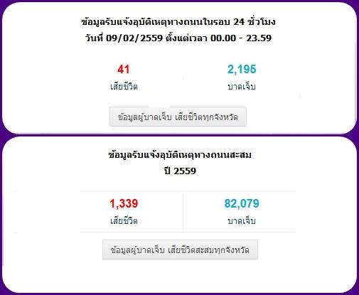 **ข้อมูลรับแจ้งอุบัติเหตุทางถนนในรอบ 24 ชั่วโมง วันที่ 09/02/2559 ตั้งแต่เวลา 00.00 - 23.59 น.**