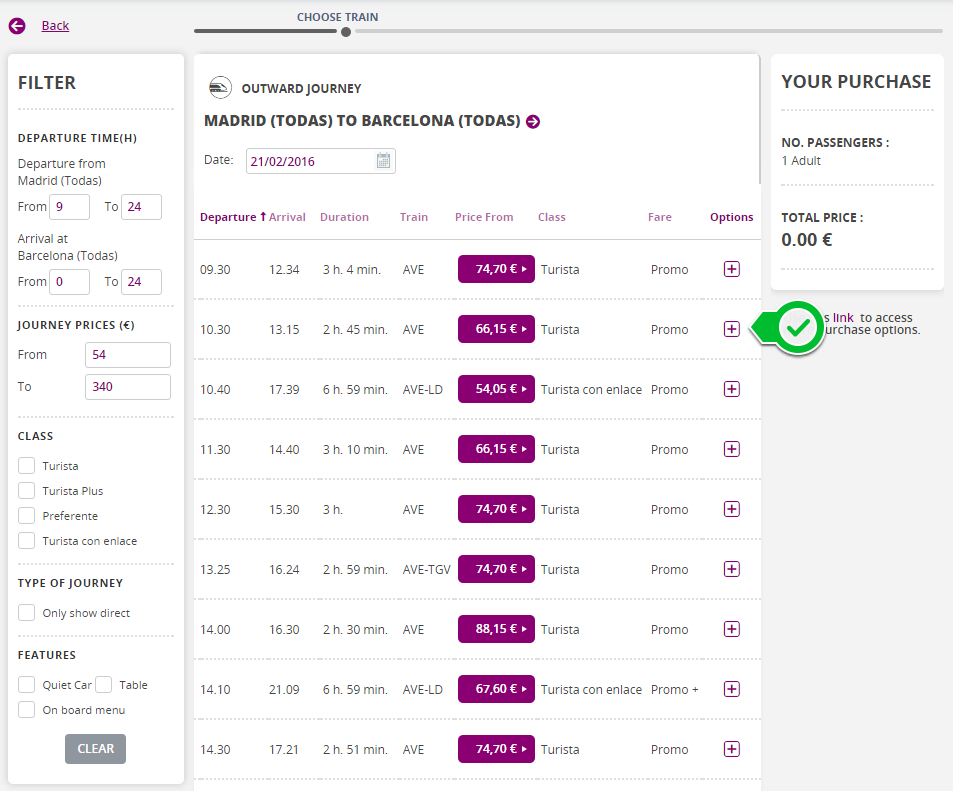 ตัวอย่างผมเลือกขบวน 10:30 น. คลาส Tourista (ชั้น 2) ราคา Promo = 66.15 EUR