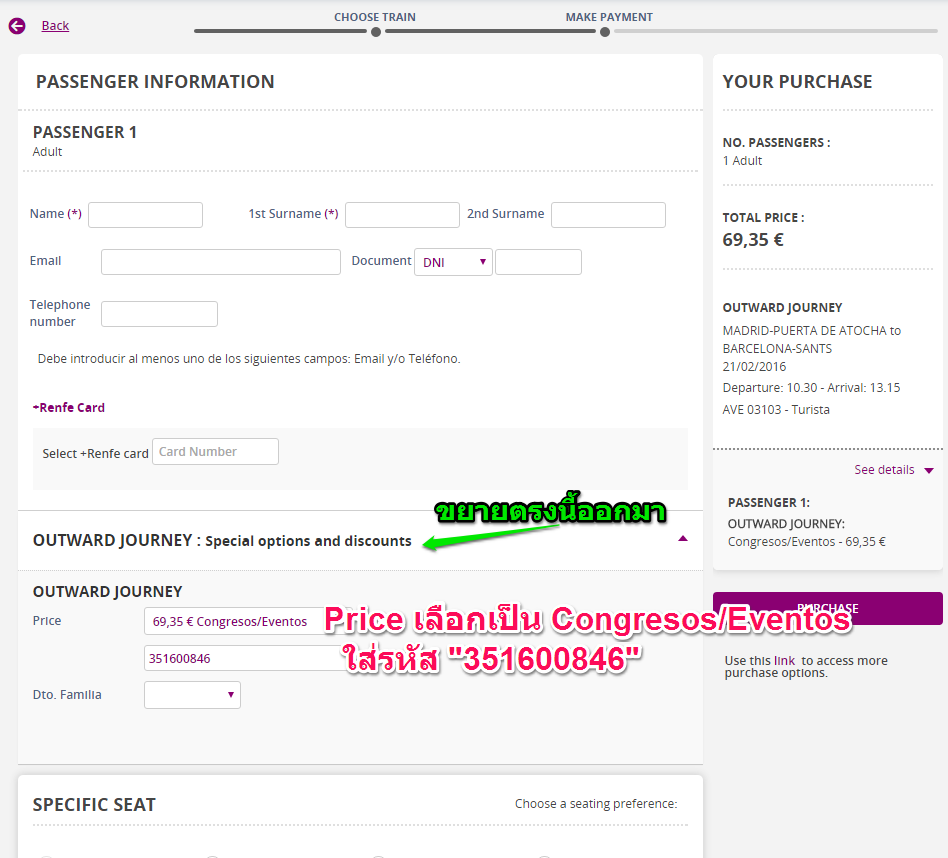 โดย Code ส่วนลดคือ ต้องไปเลือกราคาแบบ Congresos/Eventos และใส่รหัสส่วนลด "351600846" ครับ