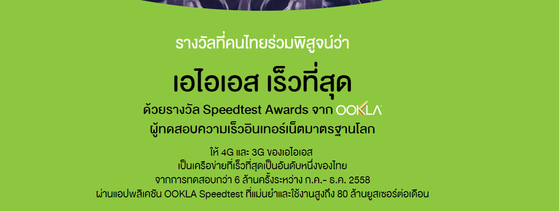 nPerf Speedtest ที่ 1 AIS ที่ 2 DTAC ที่ 3 TRUE speedtest.net Awards ที่ 1 AIS ที่ 2 My ที่ 3 Dtac OpenSignal.com World LTE Speed ที่ 22 AIS ที่ 125 TRUE ที่ 16